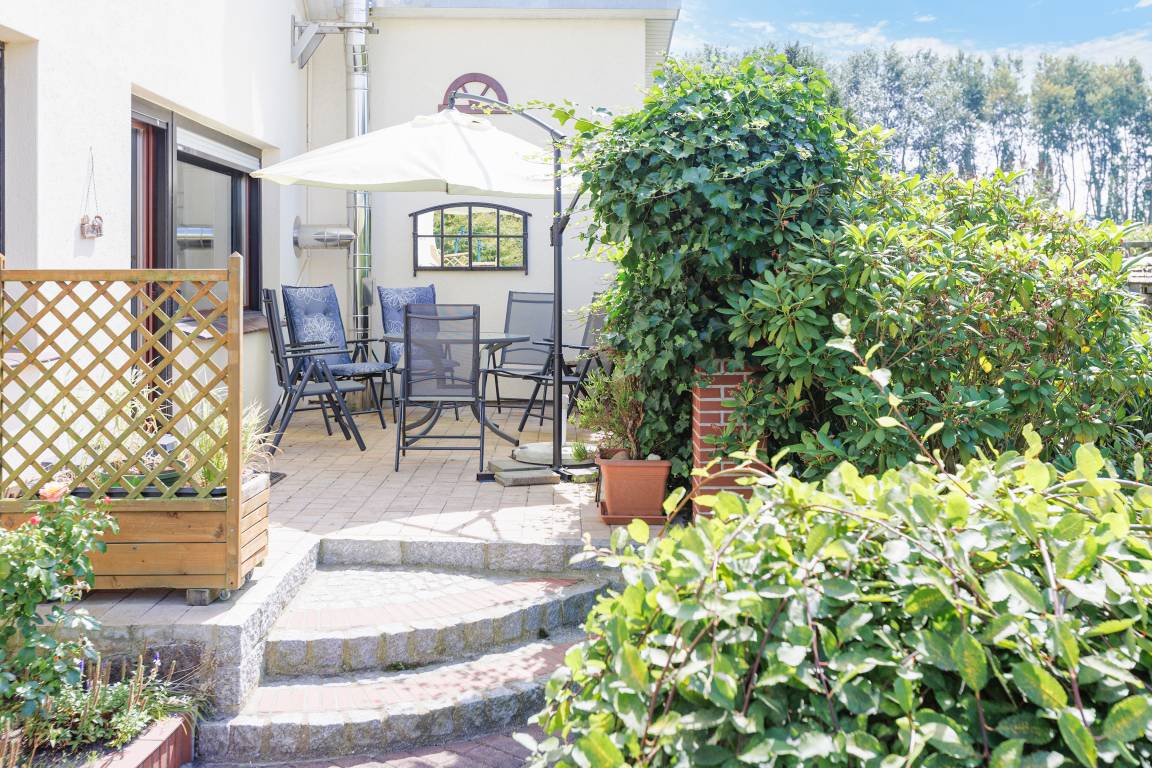 Ort: Zingst. Zentrale, dennoch ruhige Lage in einer Wohnsiedlung. Ostseestrand 600 m. Ortsmitte mit Geschäften, Restaurants 500 m. Bodden mit idyllischem Hafen 700 m. Fahrradverleih 190 m.