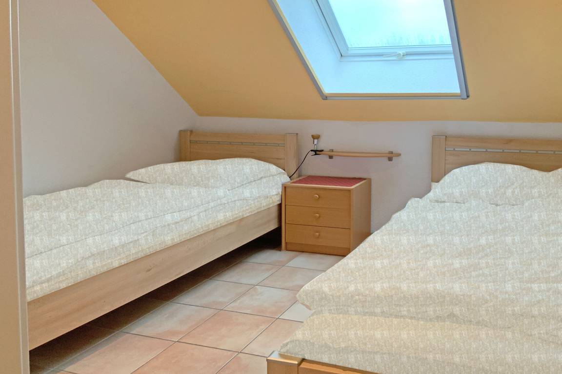Zwei gemütliche Schlafzimmer: ein Doppelbett und zwei Einzelbetten