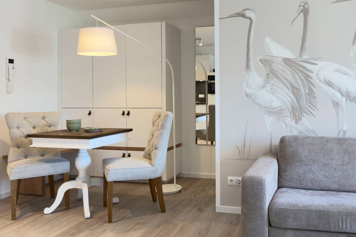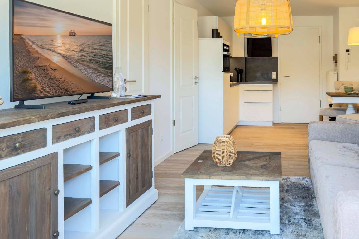 Die Ferienwohnung Strandsegler Whg. 5 empfängt Sie mit einer modernen und einladenden Atmosphäre. Der helle Wohnbereich mit bequemer Sitzgruppe bietet den perfekten Ort für entspannte Abende. Die voll ausgestattete Küchenzeile verfügt über moderne Geräte, sodass Sie mühelos kulinarische Köstlichkeiten zubereiten können. Das separate Schlafzimmer mit komfortablem Boxspringbett sorgt für erholsamen Schlaf.