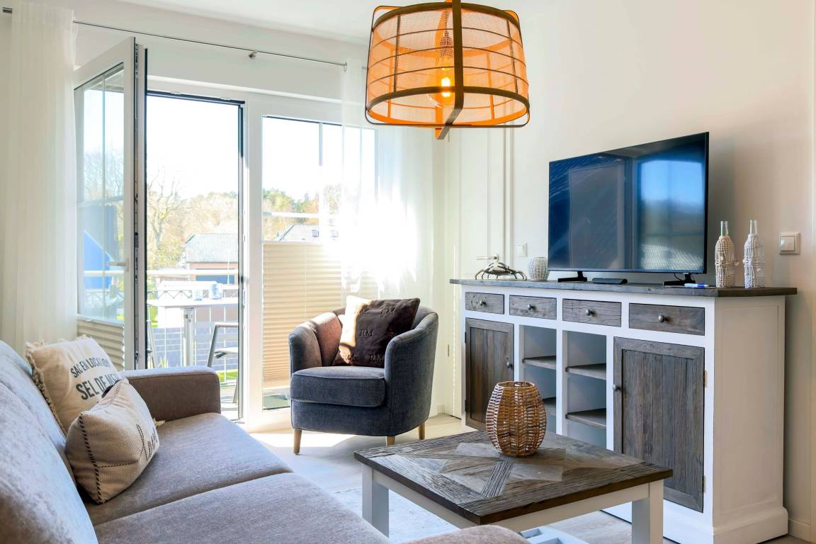 Heller Wohnbereich mit bequemer Sitzgruppe und Flachbild-TV