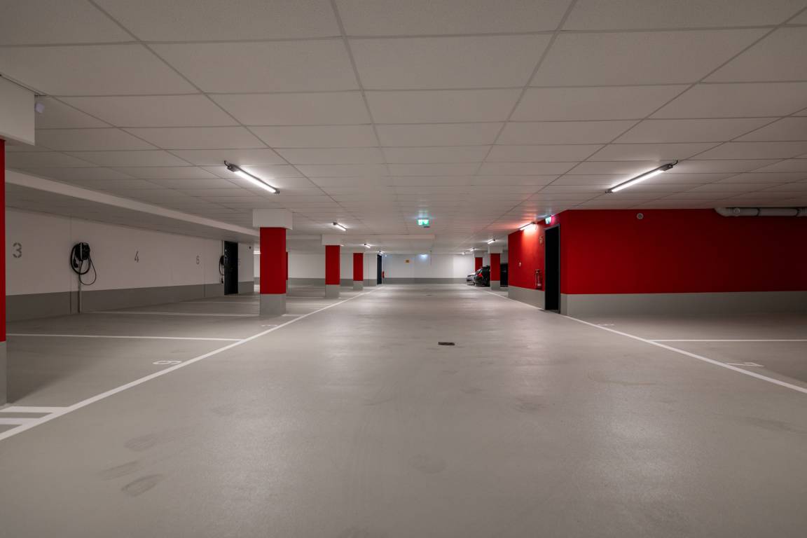 Einen privaten Tiefgaragenstellplatz mit Ladestation, bequem erreichbar über Autoaufzug