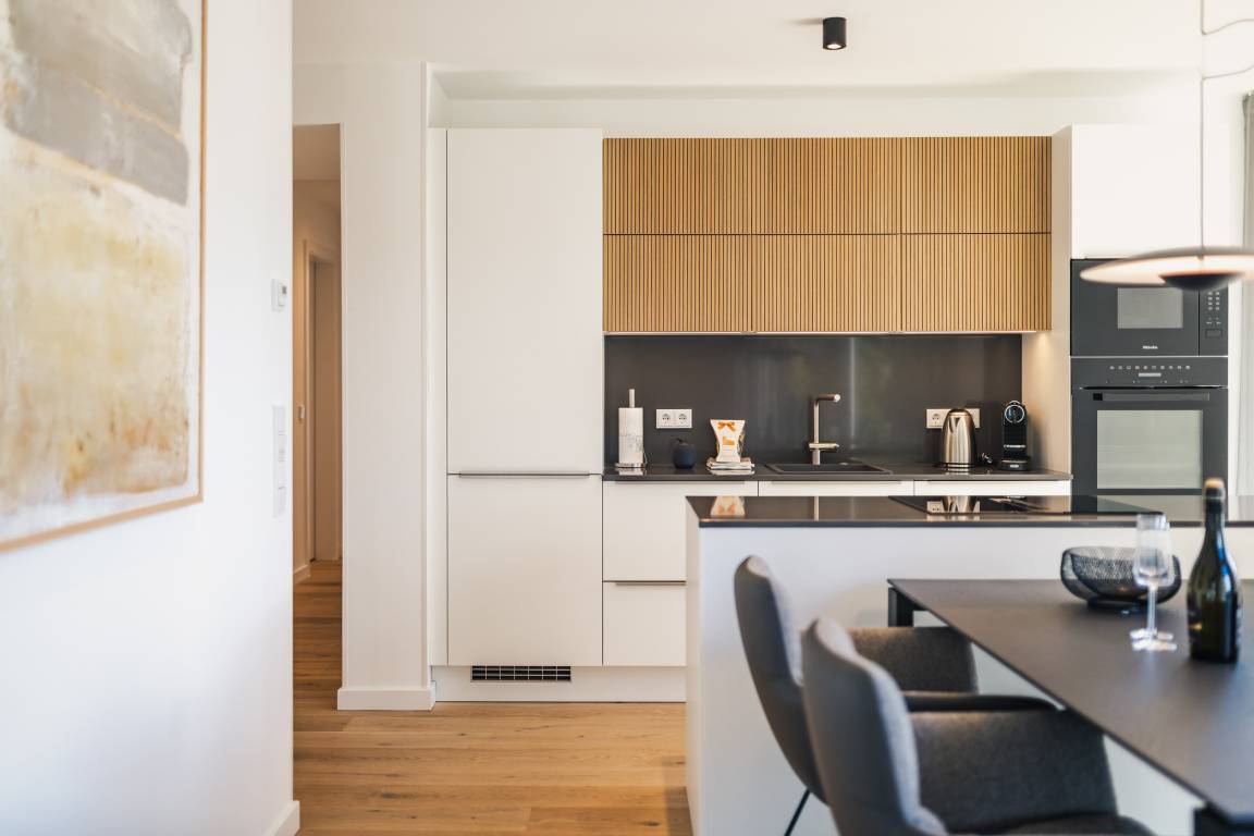 Offene, voll ausgestattete Einbauküche mit hochwertigen Markengeräten