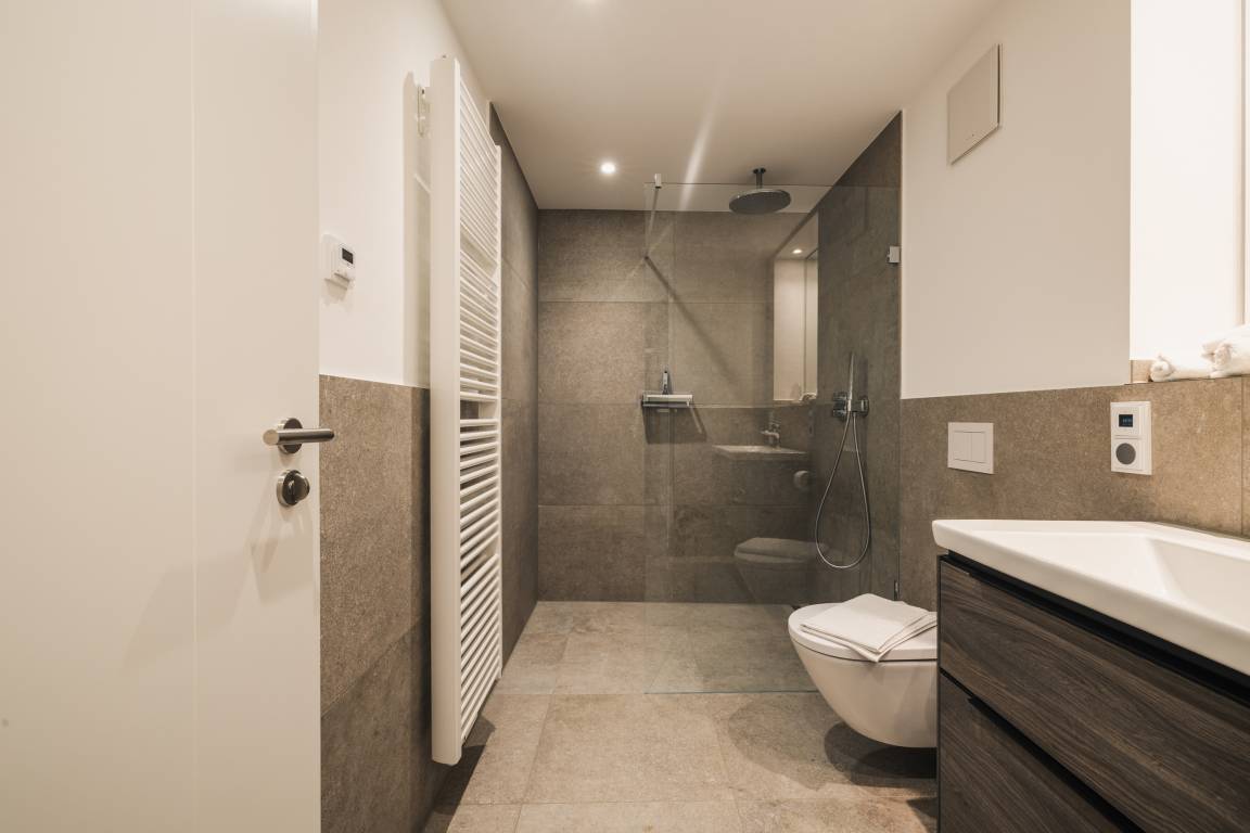 Modernes Bad mit ebenerdiger Dusche und Zugang zur privaten Sauna