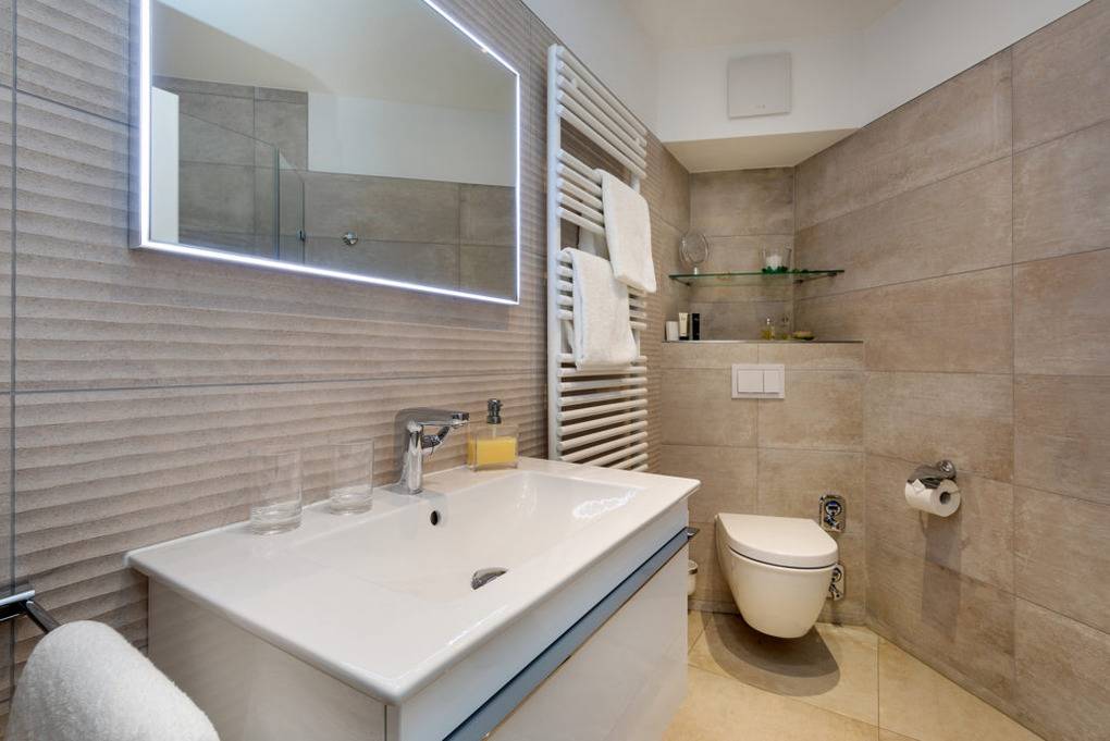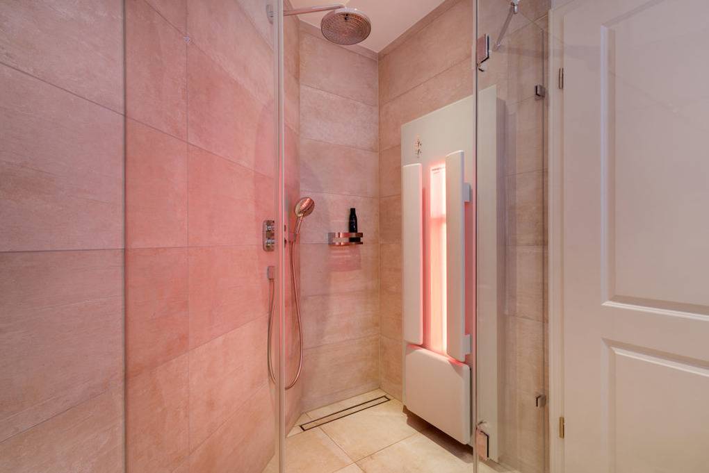Badezimmer: Modernes Bad mit bodengleicher Duschkabine und Infrarot-Dusche von Physiotherm für zusätzlichen Komfort.