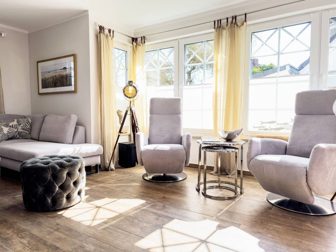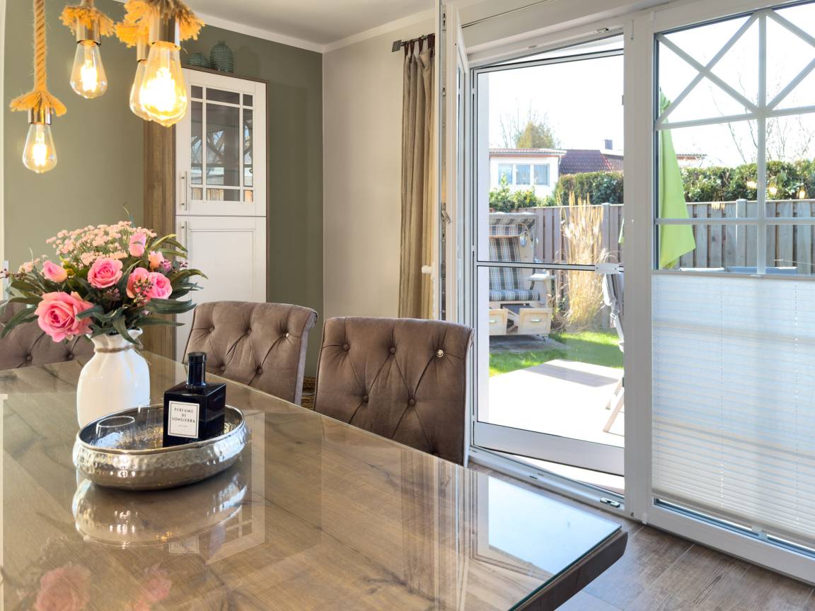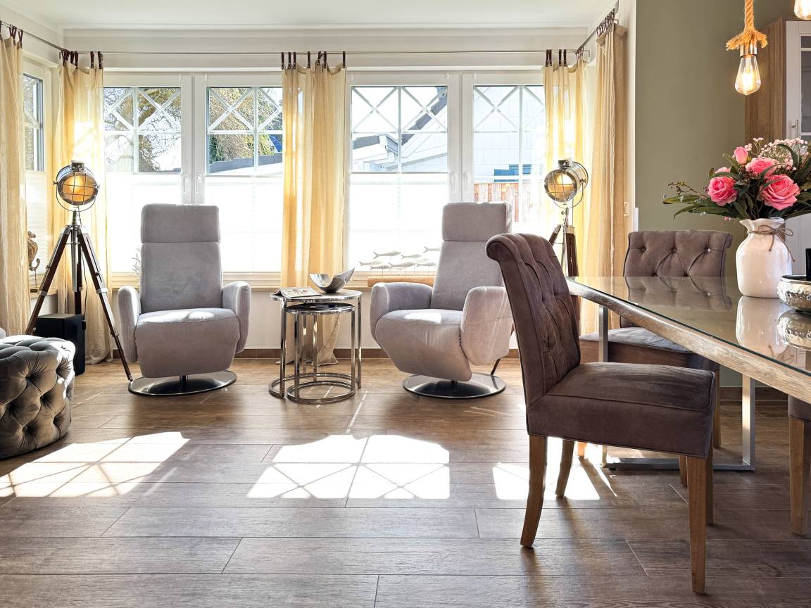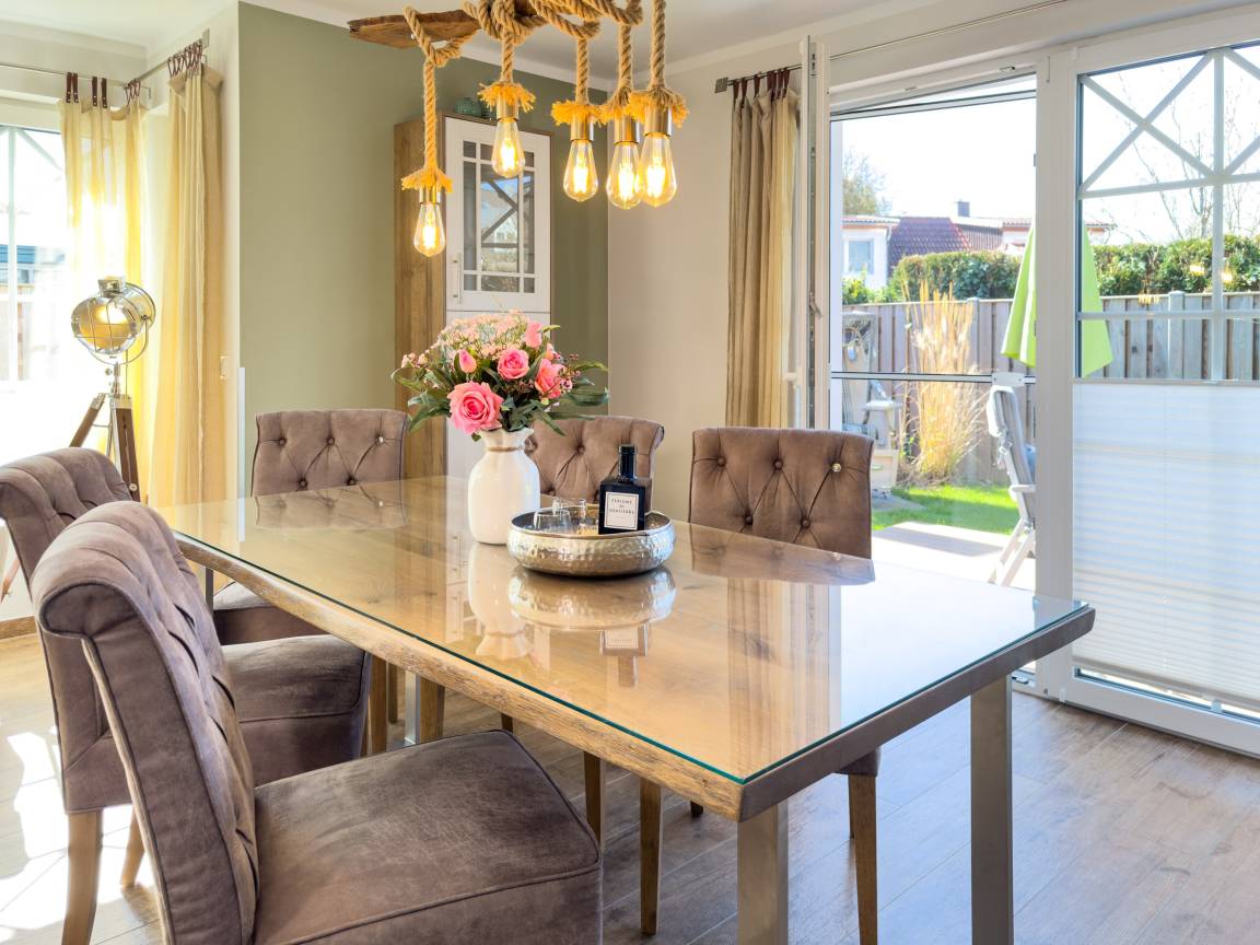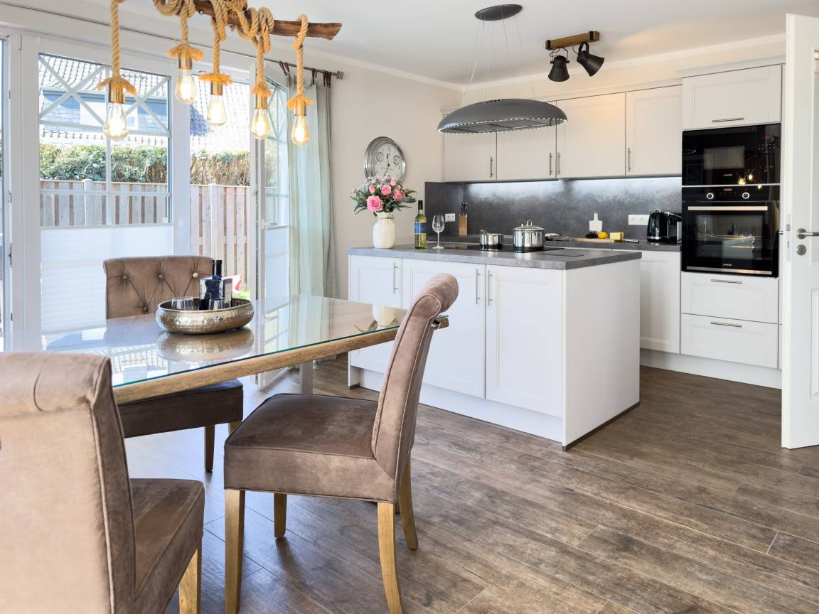 Die offene Küche mit Kochinsel lädt zu geselligen Kochabenden ein, während der große Esstisch genügend Platz für alle Gäste bietet. Das Wohnzimmer mit Kamin schafft eine behagliche Atmosphäre, ideal für entspannte Stunden nach einem Tag am Strand. Die drei Schlafzimmer im Obergeschoss versprechen höchsten Komfort mit luxuriösen Boxspringbetten und eigenem TV.