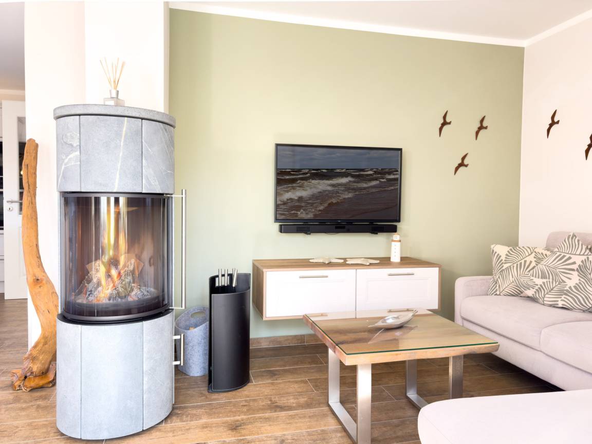 Wohnzimmer mit Kamin: Bequeme Relaxsessel, komfortable Couch und ein großer TV für entspannte Abende.