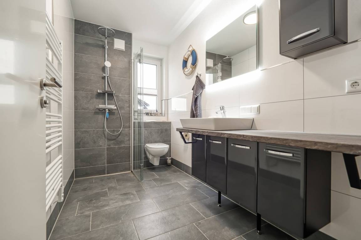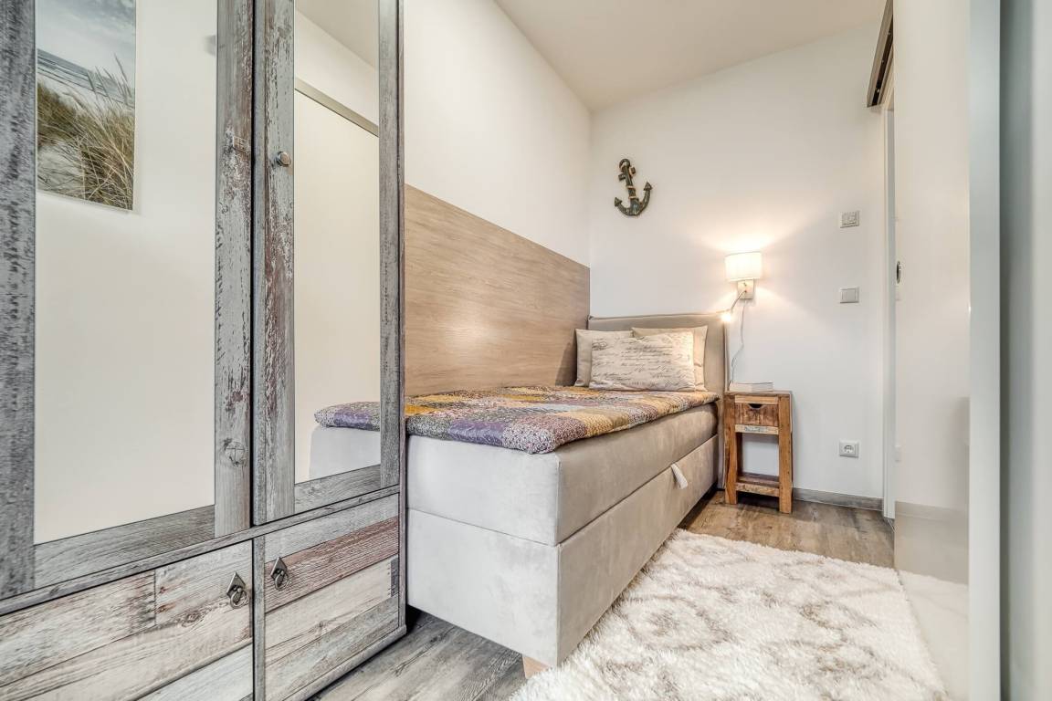Im großen Schlafzimmer garantiert ein sehr komfortables Boxspringbett erholsamen Schlaf. Das kleinere zweite Zimmer ist mit einem Einzelbett ausgestattet. Das modern eingerichtete Badezimmer ist mit einer hochwertigen bodengleichen Dusche sowie einem großen Waschtisch ausgestattet.