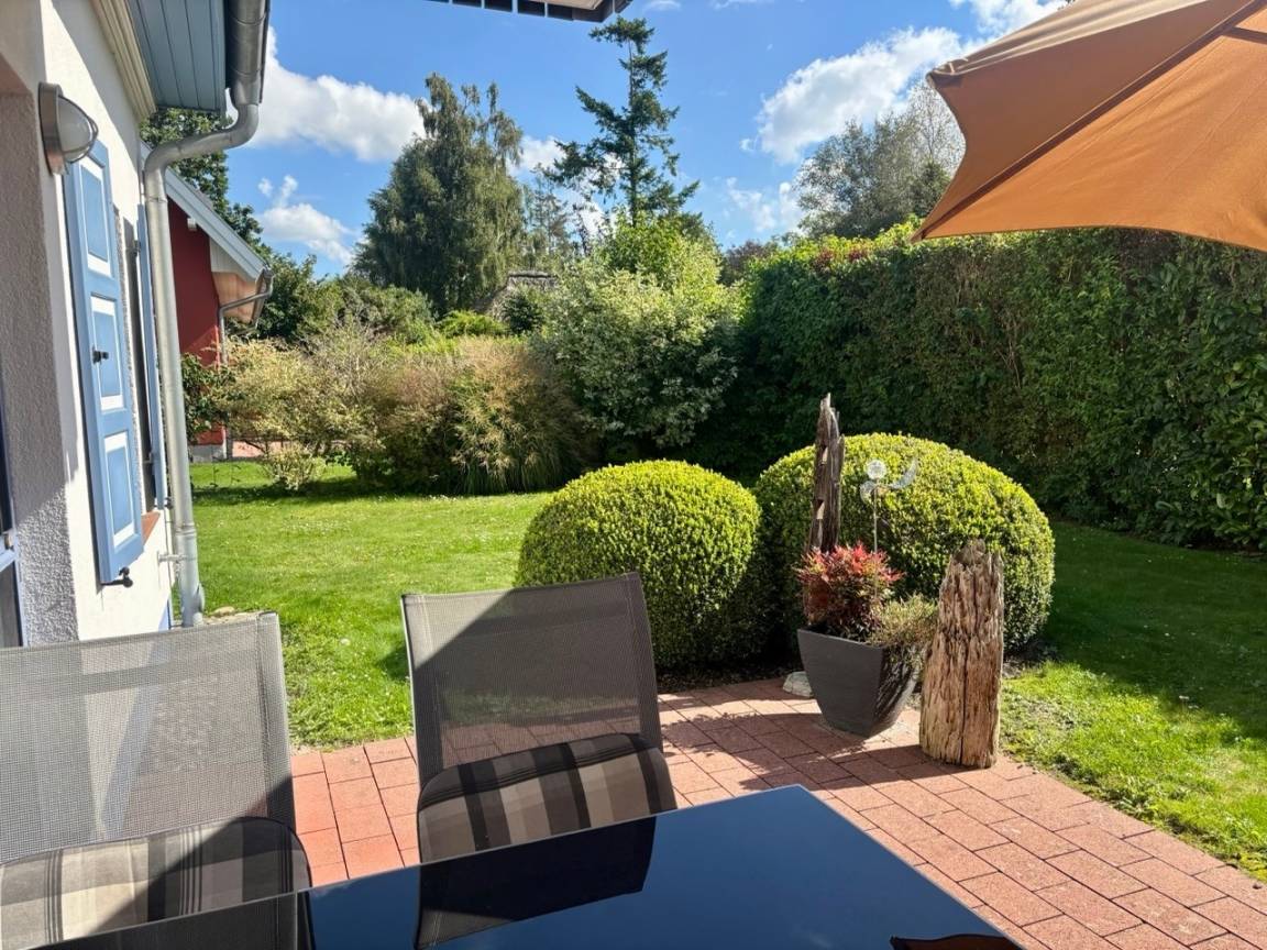 Diese liegt ruhig und ist eingebettet in eine grüne Umgebung, denn zur Wohnung gehört ein ca. 150qm großer Garten mit Rasen und Ziersträuchern zu ihrer Alleinnutzung.