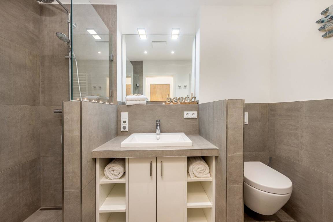Die Ferienwohnung Seekristall Smaragd befindet sich im Erdgeschoss des Hauses Seekristall und bietet auf ca. 65 qm ausreichend Platz für bis zu 4 Personen. Die Wohnung umfasst zwei individuell gestaltete Schlafzimmer, die mit komfortablen Doppelbetten ausgestattet sind. Für optimale Dunkelheit sorgen Plissees an den Fenstern. Das moderne Badezimmer verfügt über eine bodenebene Dusche, ein WC und praktische Ablagemöglichkeiten.