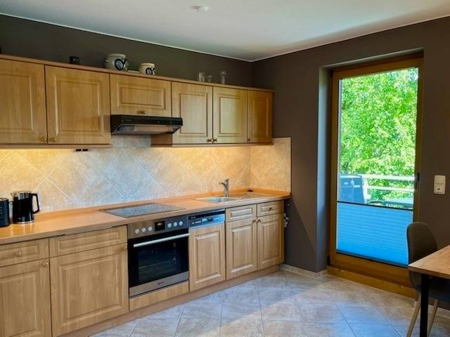 Die gut ausgestattete Küche besitzt unter anderem einen Kühlschrank, einen Herd zum Kochen und eine Spülmaschine.