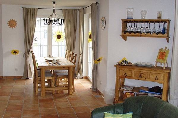 Die exklusiv und komfortabel ausgestattete Doppelhaushälfte ist reetgedeckt und hat ein Wohnfläche von ca. 85qm. Das Haus liegt ruhig zwischen Bodden und Ostsee. Zum Haus gehört ein Stellplatz und ein Carport, in dem auch Fahrräder sicher und trocken verschlossen werden können. Zum Strand sind es ca. 600m. Das Kurmittelzentrum ist 150m entfernt. Die 2007 fertiggestellte Doppelhaushälfte ist nach Südwesten ausgerichtet und den ganzen Tag lang sonnig und hell. Sie verfügt über drei Schlafräume sowie zwei Duschbäder und ein Gäste WC. Das Haus bietet für bis zu 6 Personen Schlafmöglichkeiten (1x Doppelbett 180cm, 1x Doppelbett 140cm und 2x Einzelbett 90cm). Außerdem ist ein klappbares Kinderbett (125 x 55cm) ,ein Hochstuhl und eine Waschmaschine vorhanden. Die Küche ist komplett ausgestattet mit Herd, Backofen, Geschirrspüler, Kühlschrank mit ***Eisfach, Kaffeemaschine, Toaster, Wasserkocher, Mixer, Waffeleisen usw. Im Wohnzimmer finden Sie einen Kaminofen für gemütliche Abende vor. Für Regentage steht ein TFT-SAT-TV, ein DVD-Player, und eine Spielesammlung zur Verfügung.
