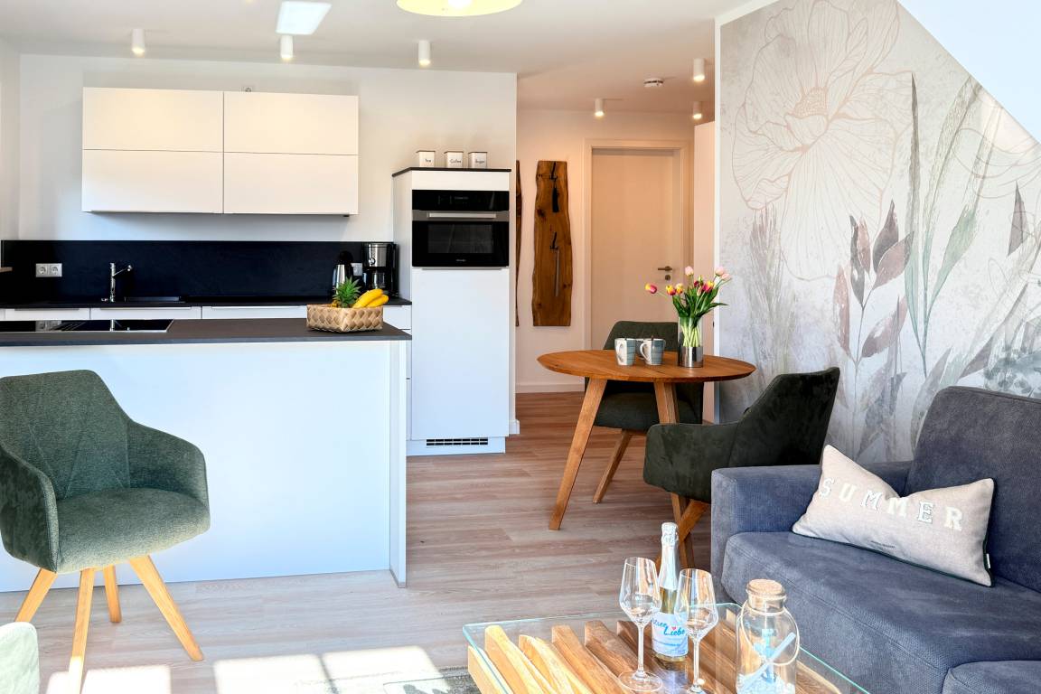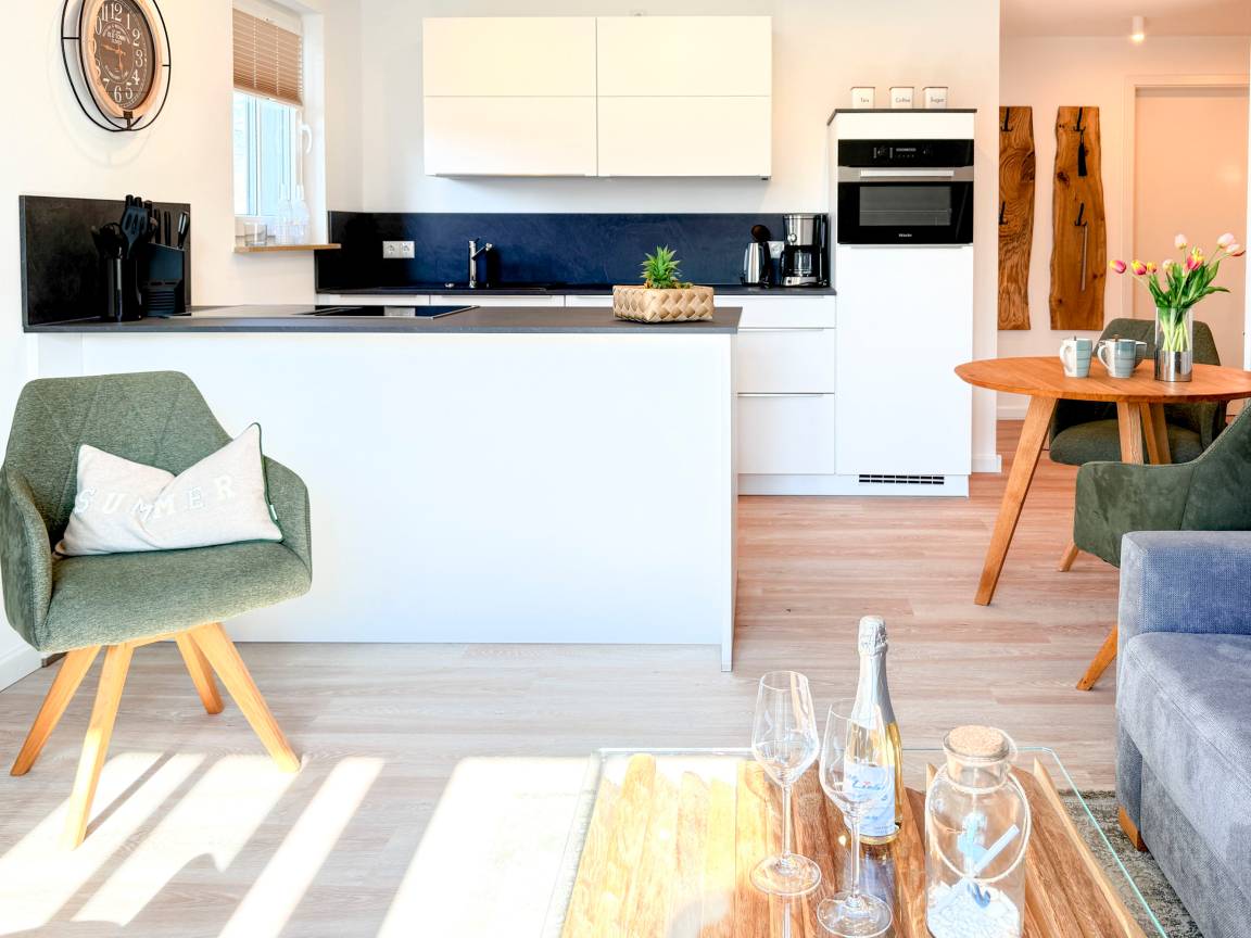 Die Ferienwohnung Störtebekerkoje 12/6 empfängt Sie mit einer modernen und einladenden Atmosphäre. Der gemütliche Wohn- und Essbereich bietet den perfekten Ort für entspannte Abende. Die voll ausgestattete Küchenzeile verfügt über moderne Geräte wie Geschirrspüler, Backofen, Kochfeld, Kühlschrank, Toaster, Wasserkocher und Filterkaffeemaschine, sodass Sie mühelos kulinarische Köstlichkeiten zubereiten können. Das separate Schlafzimmer sorgt für erholsamen Schlaf.