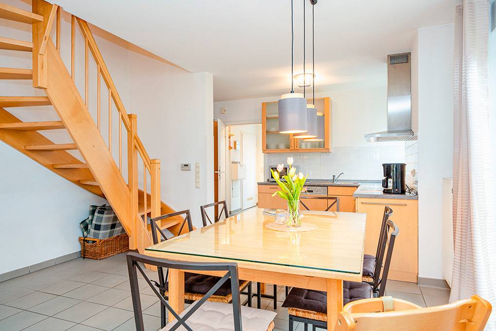 D 67.5304 Ferienhaus 1-6 Pers.: Schöne, großzügige 4-Zimmerhaushälfte mit 85 qm Wohnfläche über 3 Etagen. Nichtraucherhaus. Parterre: Heller, freundlicher Wohn-/Essraum mit gemütlicher Couchgarnitur, Sat-TV, Stereoanlage, Esstisch, moderner Einbauküche (Backofen, Mikrowelle, Spülmaschine). Bad: Du, Wb, WC. 1. Etage: 2 Doppelzimmer. Bad: Du, Wb, WC, Waschmaschine. Treppe in den offenen Spitzboden: 2-Bettzimmer.