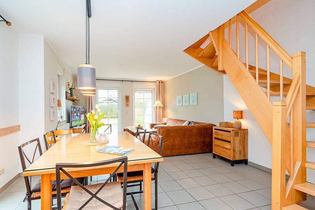 Haus: 2 komfortable Doppelhäuser, jede Haushälfte mit großen Platzangebot. Nichtraucherhäuser. 3 Schlafräume, 2 Bäder. Moderne, geschmackvolle Einrichtung. Kostenlosem Internetzugang über W-LAN. Zentralheizung. Terrasse mit Sitzmöbeln. Garten mit Rasenfläche. Fahrradschuppen. 2 Pkw-Stellplätze pro Haushälfte.