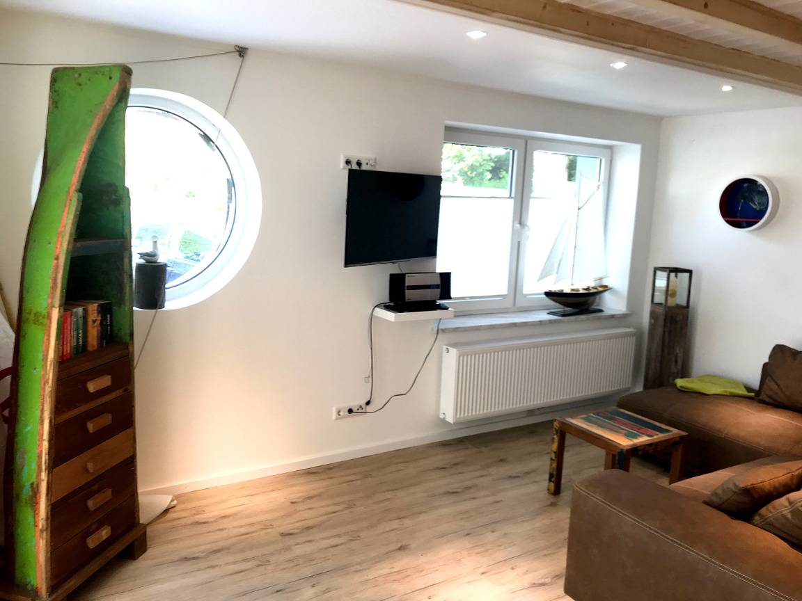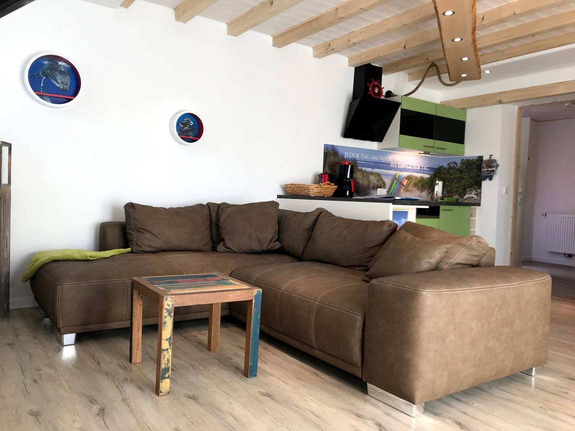 Das geräumige Wohnzimmer bietet für 2 Personen eine Aufbettungsoption auf einer Eckcouch in Boxspring Federkern Qualität. Die moderne L-Küche und der gemütliche Essplatz sind maritim gestaltet ? die Massivholzmöbel in liebevoller Handarbeit aus ehemaligen Fischerbooten gefertigt. Technisch ist die Wohnung voll ausgestattet.
