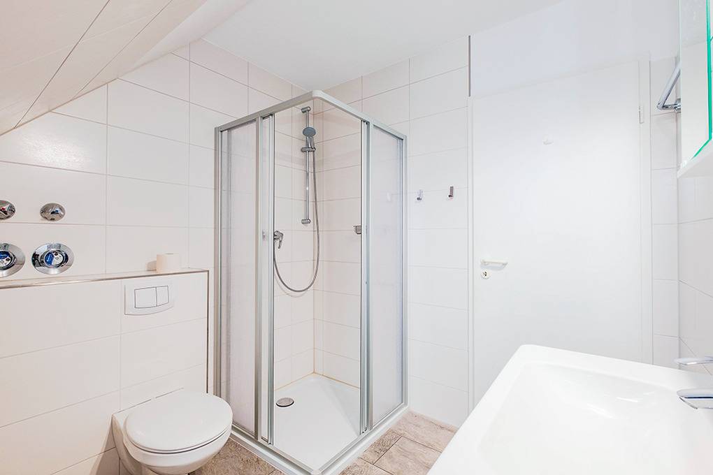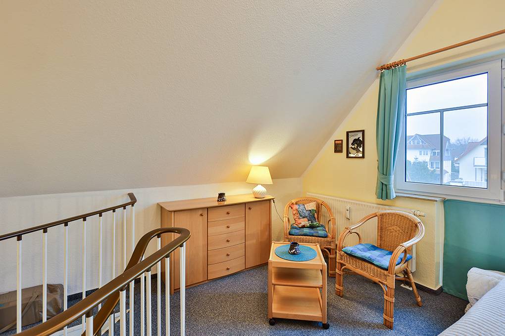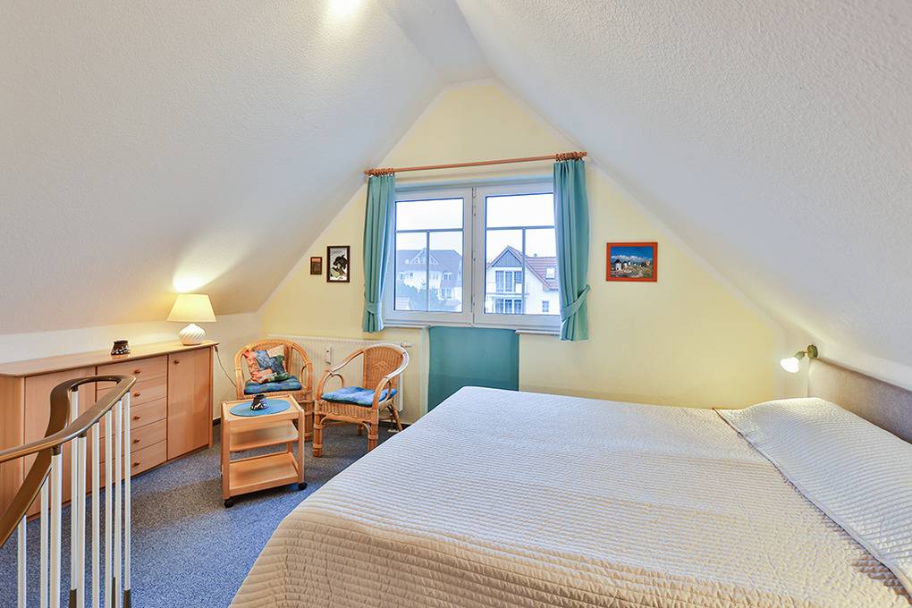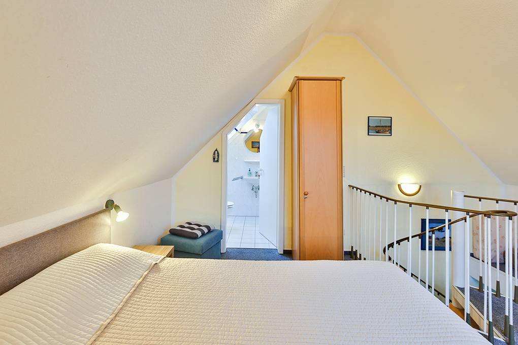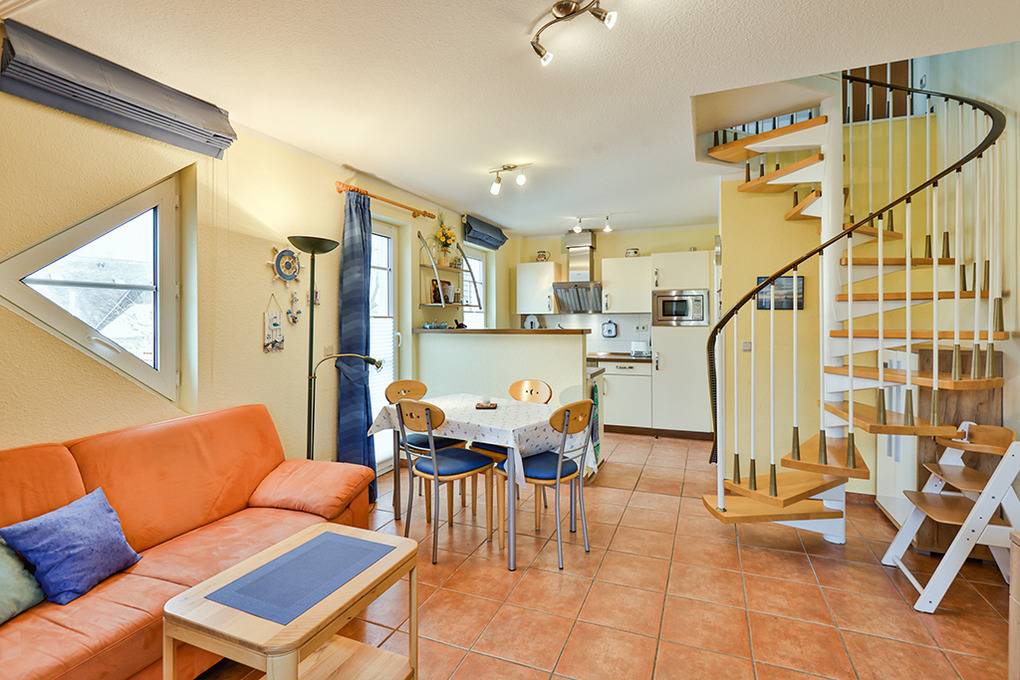 D 67.65 Wohnung 1-4 Pers.: 2-Zimmerwohnung mit 55 qm Wohnfläche über 2 Etagen, 1. Etage. Nichtraucherwohnung. Heller, freundlicher Wohn-/Essraum mit Couchgarnitur, Flachbild-Sat-TV, Radio/CD, Esstisch, thekenartig abgetrennter Küchenzeile (Backofen, Mikrowelle, Spülmaschine). Doppelzimmer. Bad/WC. Wendeltreppe ins ausgebaute Dachgeschoss: Galerie, offen zum Wohnraum, mit Doppelbett, separatem WC. Balkon mit Sitzmöbeln.
