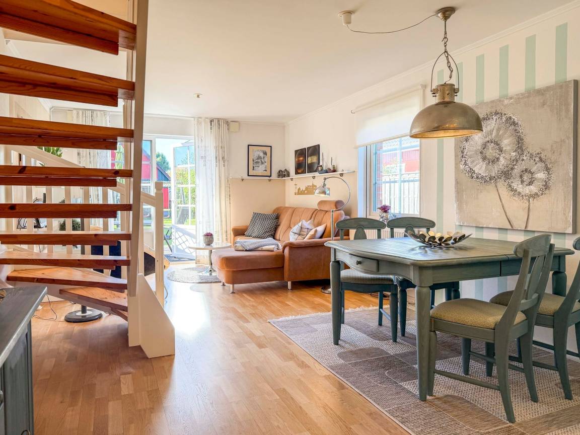 Das Ferienhaus Wismar empfängt Sie mit einer warmen, freundlichen Atmosphäre. Hier trifft modernes Wohnen auf norddeutschen Charme. Der offene Wohnbereich ist das Herzstück des Hauses – ideal für gemeinsame Abende mit der Familie, Spiele, Filme oder einfach zum Seele-baumeln-lassen. Große Fenster lassen viel Licht herein und öffnen den Blick ins Grüne.