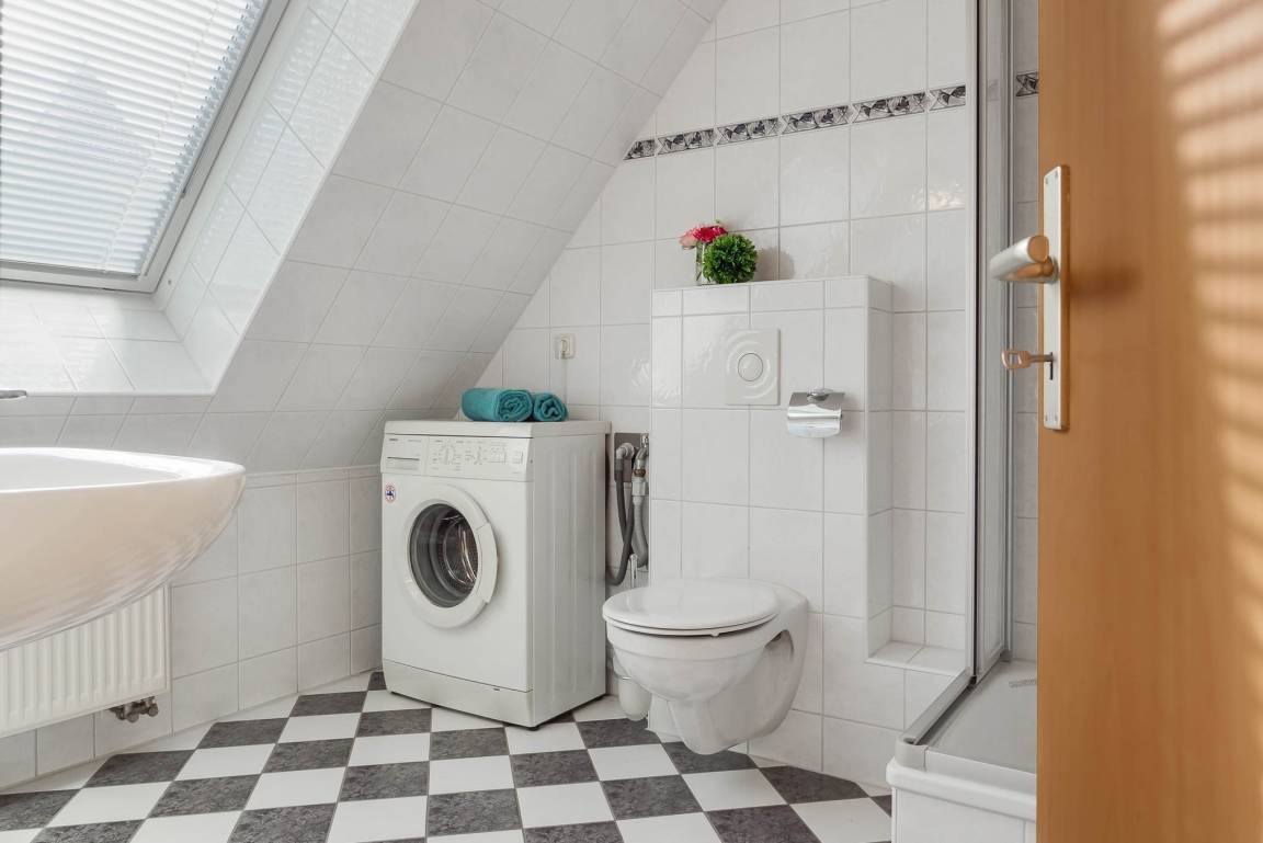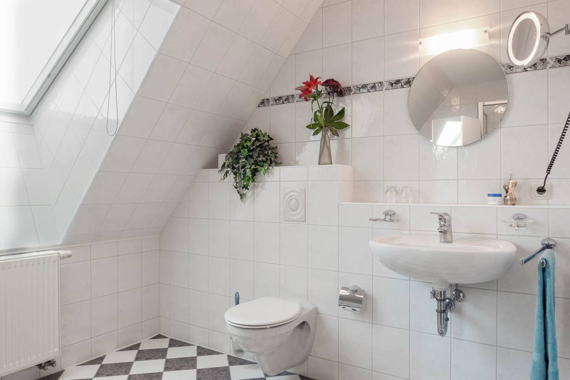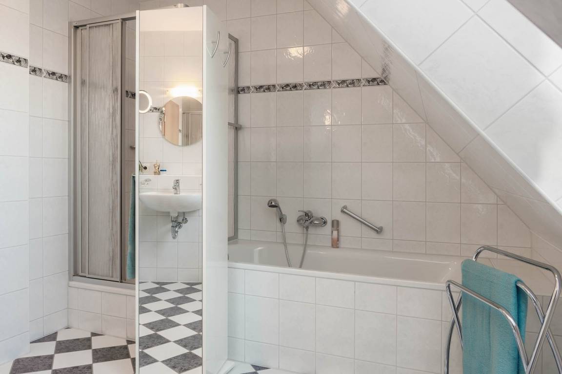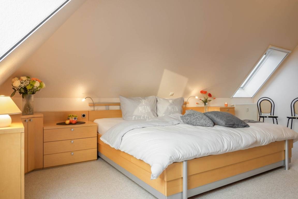 90 qm Ferienwohnung/Apartment für 5 Personen (max. 4 Erwachsene), 1. Stock und Dachgeschoss. Unmittelbar im Ortskern, aber in ruhiger Lage, nur 400m vom Strand entfernt liegt diese Nichtraucher-Wohnung.