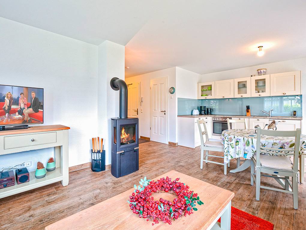 D 67.67 Wohnung 1-2 Pers.: 2-Zimmerwohnung mit 50 qm Wohnfläche, Parterre. Wohn-/Essraum mit Kaminofen, Couchgarnitur, Sat-TV, DVD, Stereoanlage, Esstisch, gut ausgestatteter Küchenzeile (Backofen, Spülmaschine). Doppelzimmer. Bad/WC. Terrasse mit Sitzmöbeln, anschließend schöner Garten.