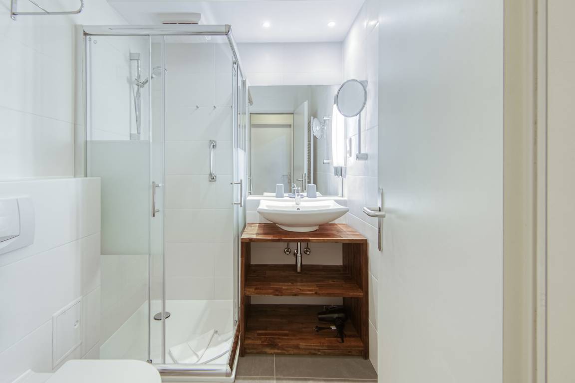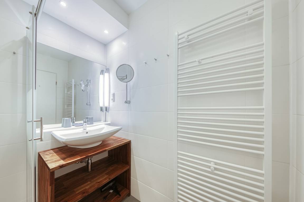 Ein innenliegendes Badezimmer mit hellen Fliesen, Dusche, WC, Waschbecken und Handtuchheizkörper steht Ihnen zur Verfügung. Zusätzlich finden Sie einen Föhn und einen Kosmetikspiegel.