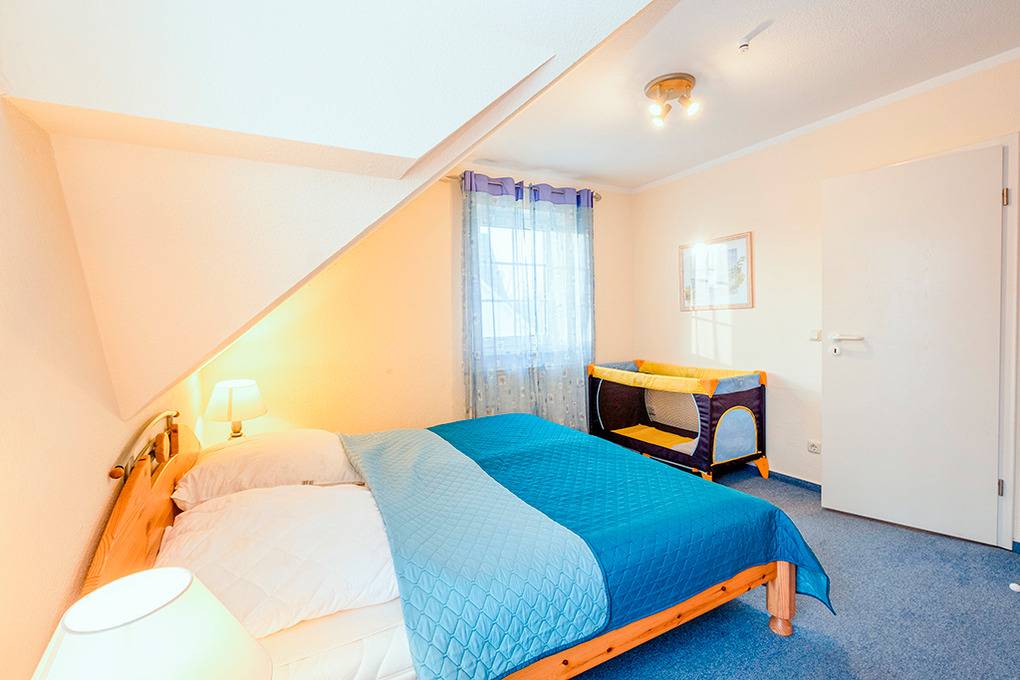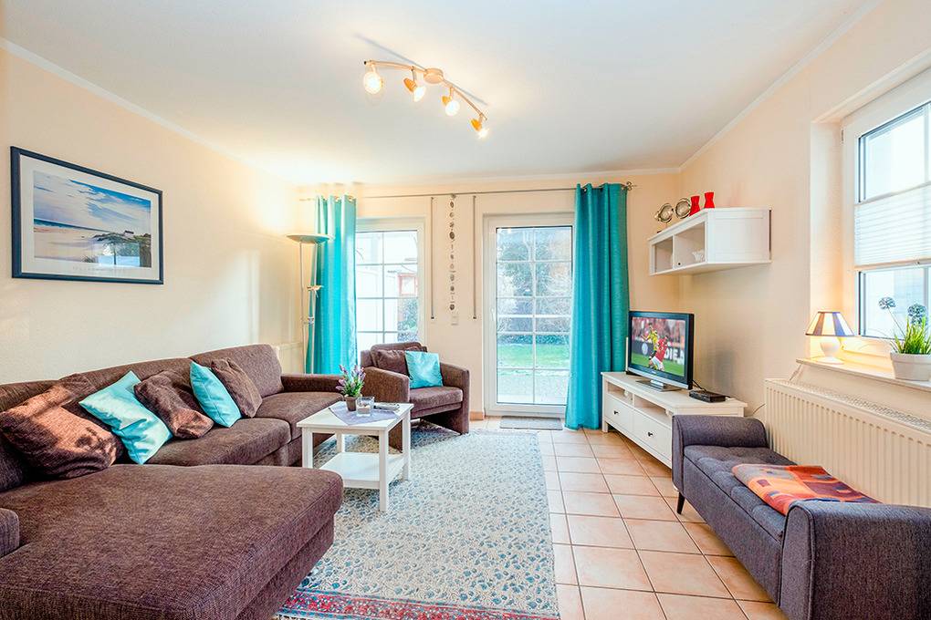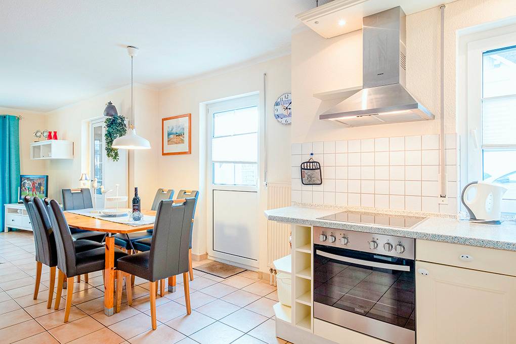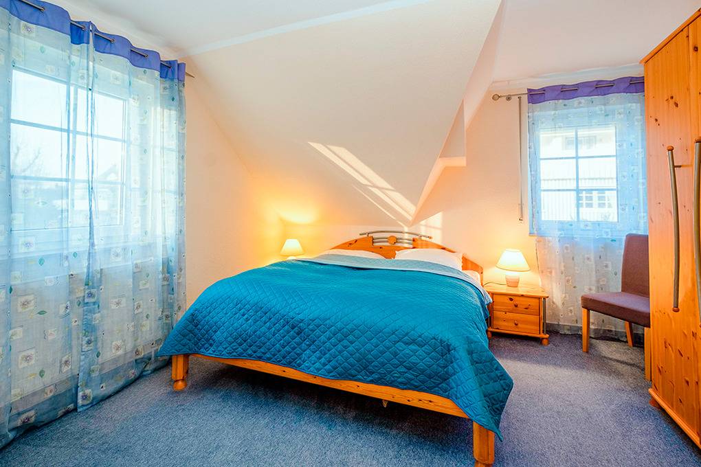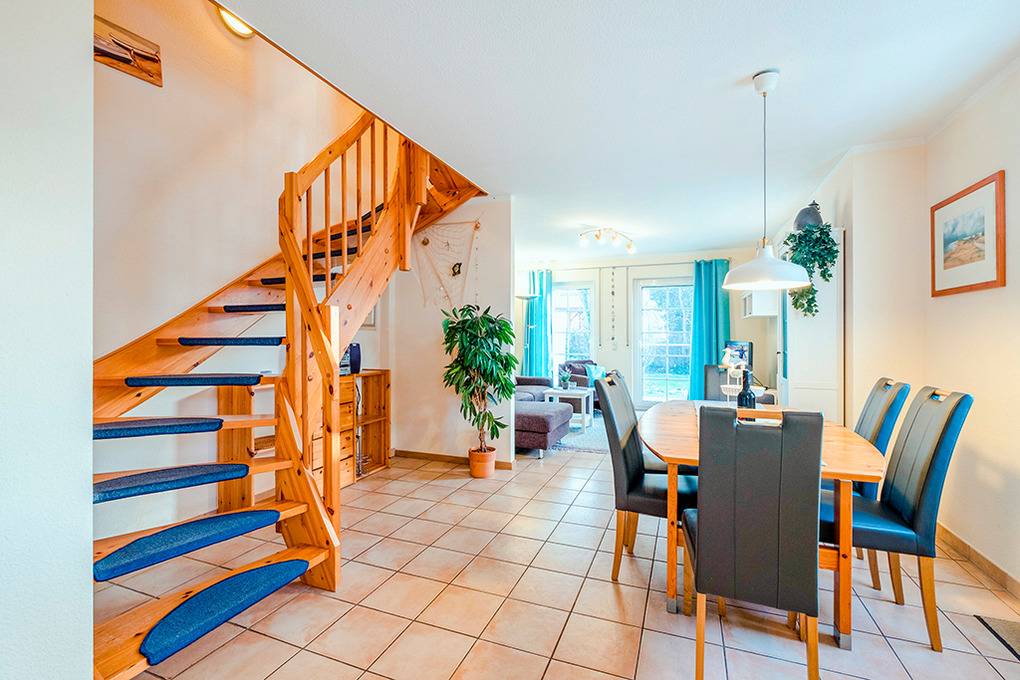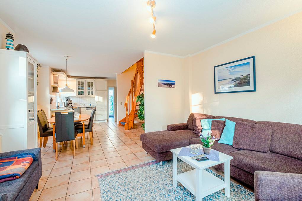 D 67.4103 Ferienhaus 1-6 Pers.: 4-Zimmerhaushälfte mit 85 qm Wohnfläche über 3 Etagen. Parterre: Geräumiger Wohn-/Essraum mit gemütlicher Couchgarnitur, Sat-TV, Esstisch, Einbauküche (Backofen, Spülmaschine). Bad/WC. 1. Etage: 2 Doppelzimmer. Bad/WC. Treppe in den offenen Spitzboden: Doppelzimmer.