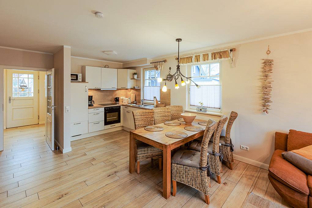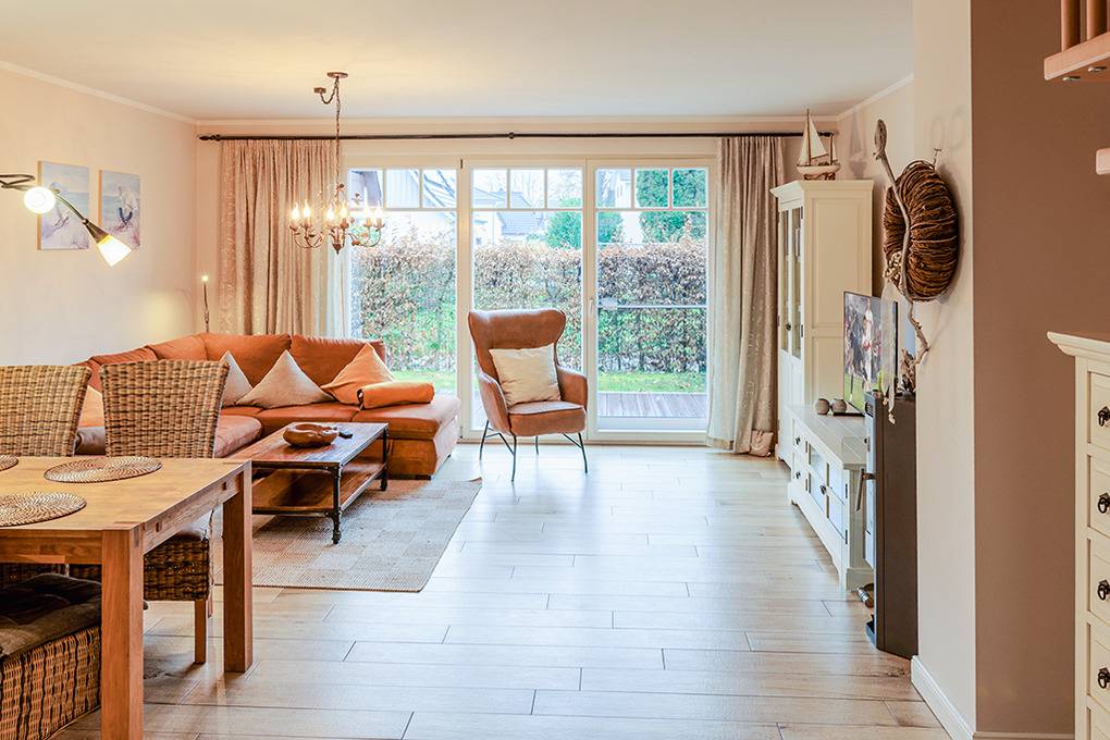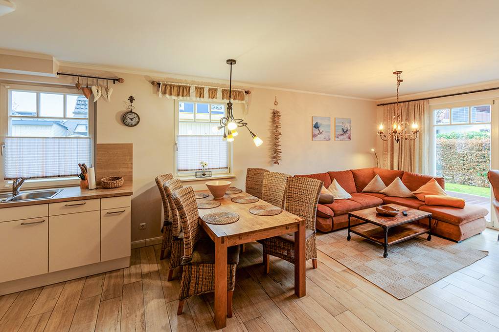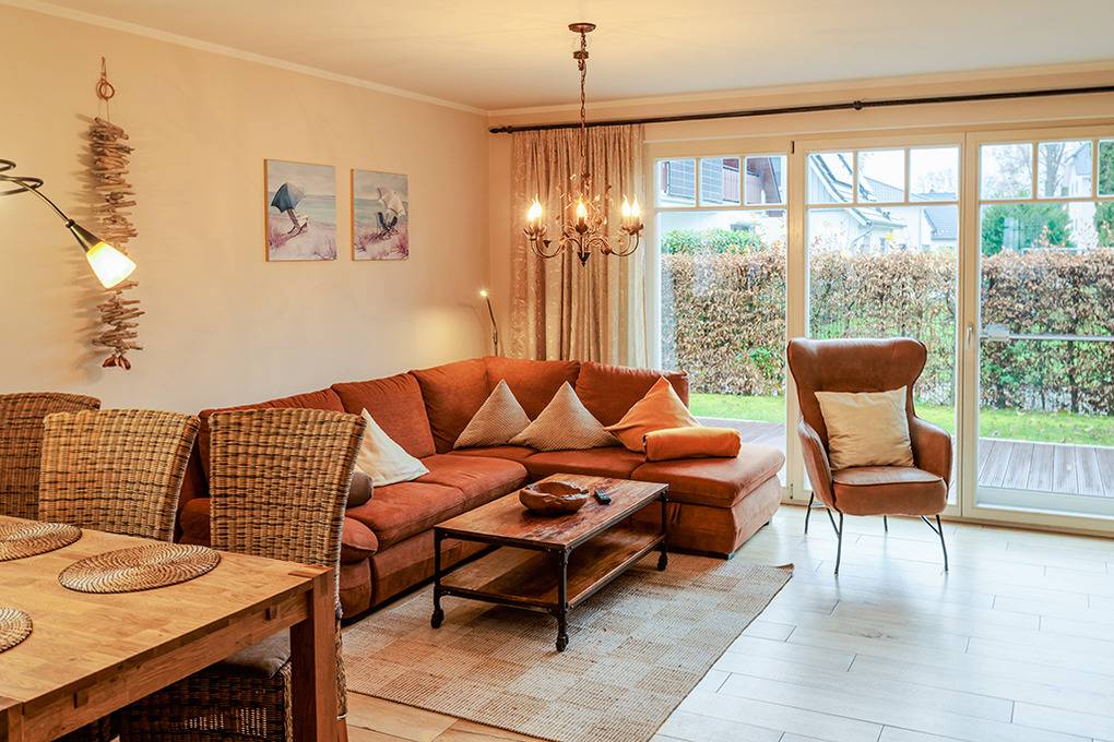 Haus: Komfortable Doppelhaushälfte mit Kaminofen, 3 Schlafzimmern, 2 Bädern. Gehobene Ausstattung mit geschmackvoller Möblierung. Kostenloser Internetanschluss über W-Lan. Zentralheizung (Fußbodenheizung). Alle Räume mit Insektenschutzgitter. Süd-Terrasse mit Sitzmöbeln, Sonnenschirm, Grill, anschließend kleiner Garten mit Fahrradschuppen. 2 Pkw-Stellplätze am Haus.