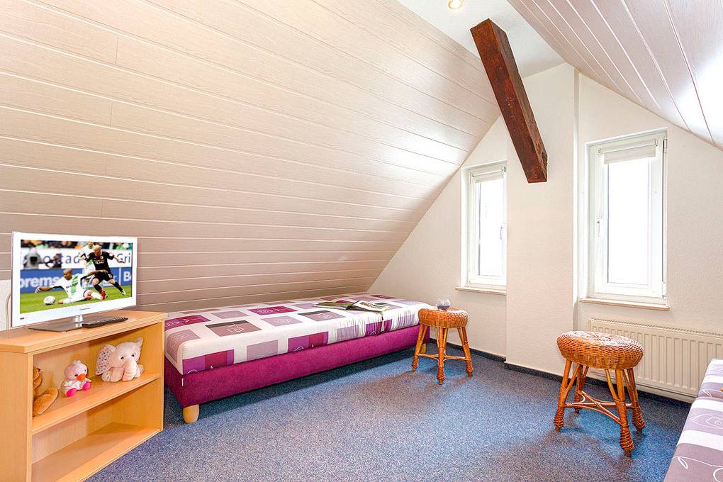 D 20.33 Wohnung 2-4 Pers.: 3-Zimmerwohnung, 40 qm Wohnfläche. Wohn-/Essraum mit Esstisch, Küchenzeile. Doppelzimmer (Durchgangszimmer). 2-Bettzimmer mit Dachschrägen. Dusche/WC.