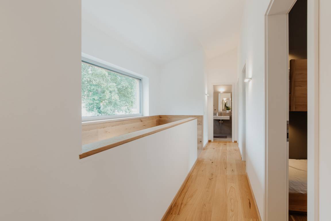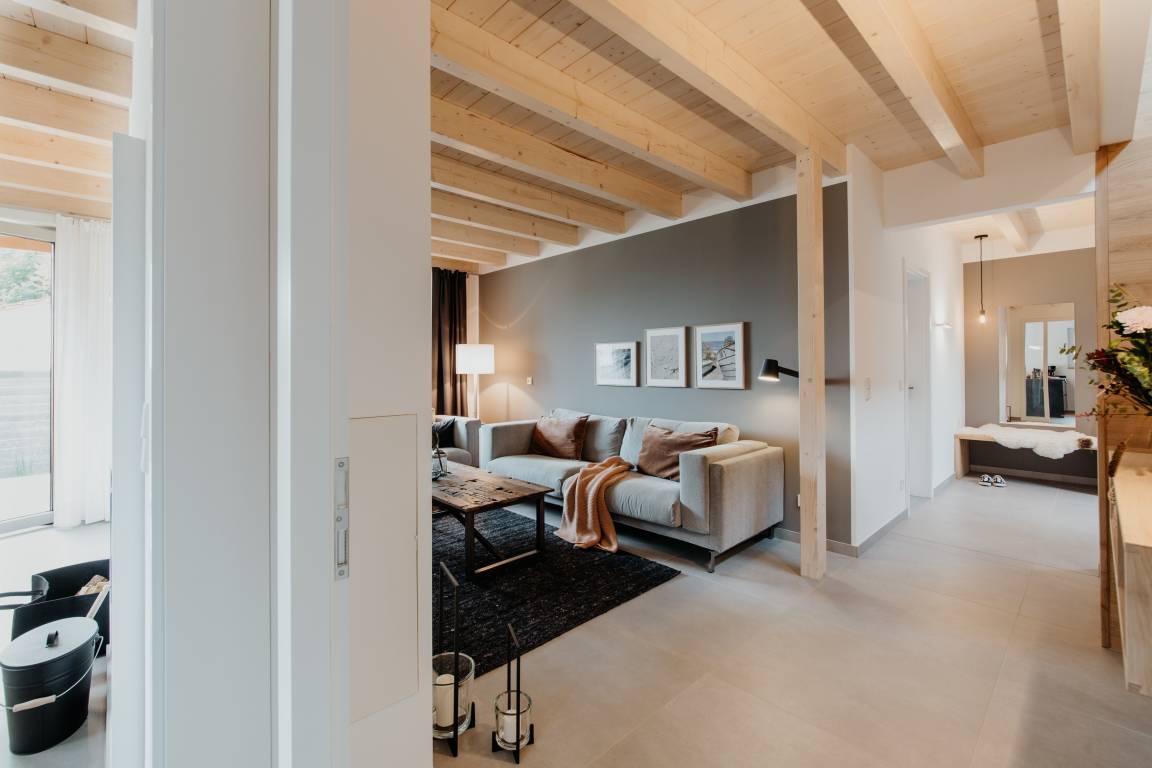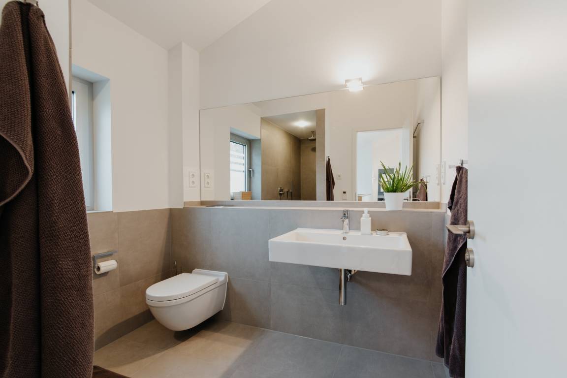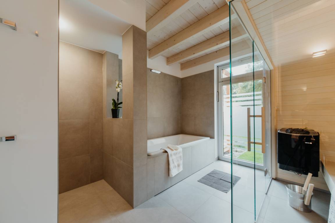 Im Erdgeschoss befinden sich die Küche, der Essbereich, das Wohnzimmer sowie das Wellnessbad mit Sauna, Wellnessbadewanne mit Skin Touch und Dusche. Vom Essbereich gelangen Sie direkt auf die überdachte Terrasse und in den dazugehörigen Garten.