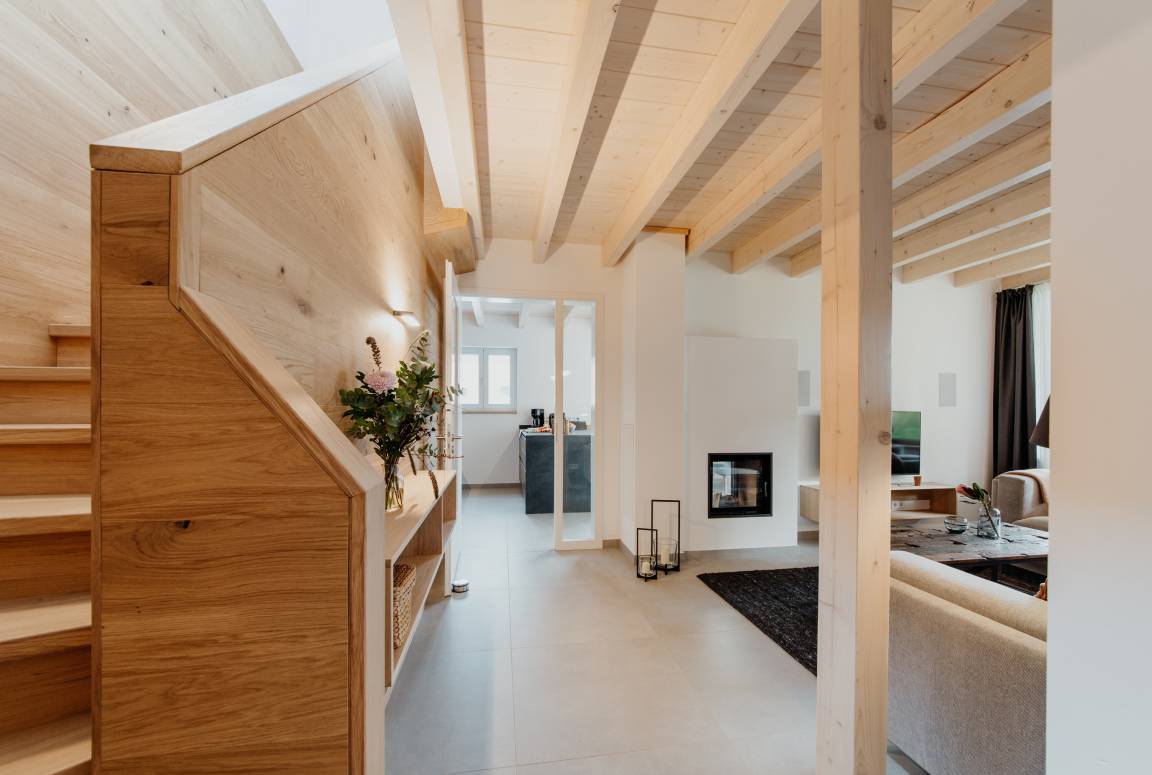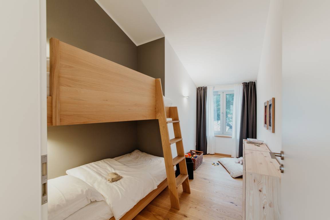 Im Obergeschoss befinden sich die vier Schlafräume. Drei der Schlafräume sind mit einem Doppelbett ausgestattet, ein weiterer Schlafraum verfügt über ein Etagenbett. Zudem gibt es im Obergeschoss zwei Duschbäder.
