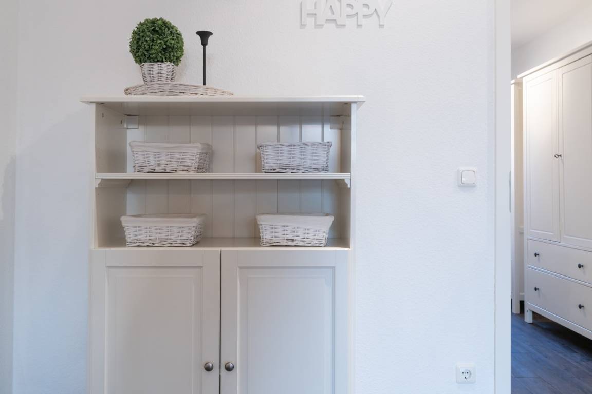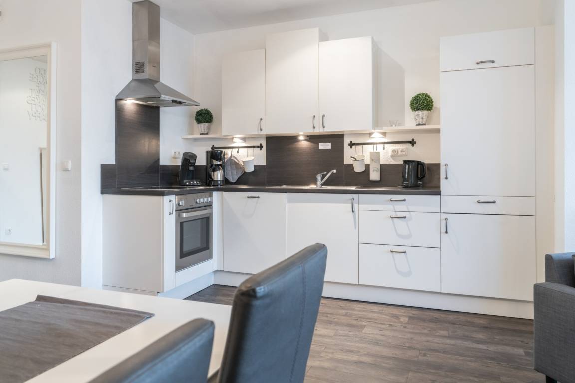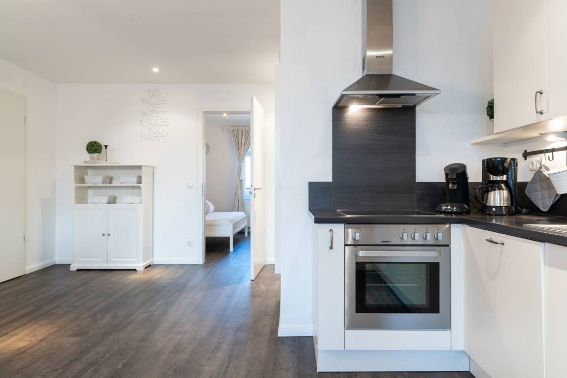 Die hier angrenzende Küchenzeile ist mit einem Kühlschrank mit Gefrierfach, einem Geschirrspüler und einem Backofen mit Cerankochfeld ausgestattet. Eine Kaffeemaschine, ein Toaster und ein Wasserkocher stehen Ihnen hier selbstverständlich zur Verfügung.