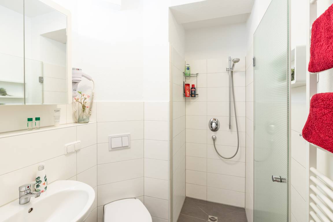 Das Badezimmer verfügt über eine Dusche (ebenerdig) und WC.
