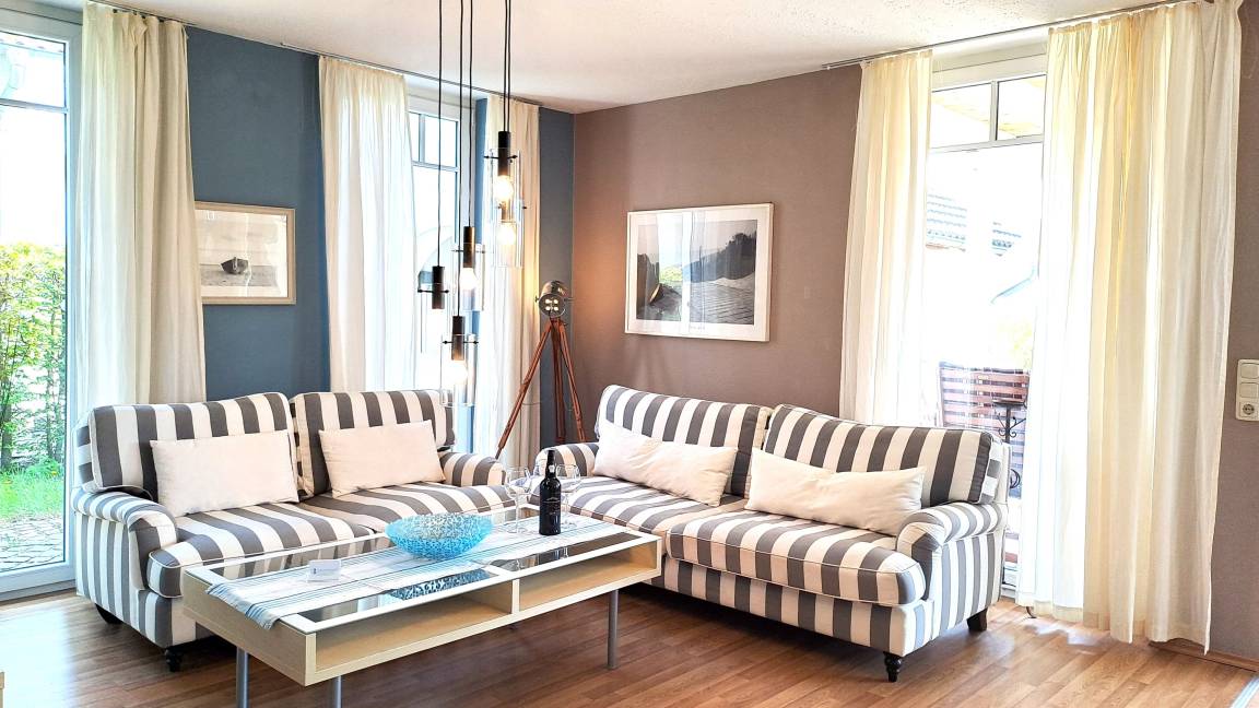 Der helle WOHNBEREICH ist mit 2 Sofas, Couchtisch, Flachbild-TV und Musikanlage ausgestattet. Hier finden Sie genug Platz für gemütliche Spieleabende mit der ganzen Familie. Vom Wohnzimmer gelangen Sie direkt auf die möblierte TERRASSE mit Grill, auf der Sie die lauen Sommerabende genießen können.