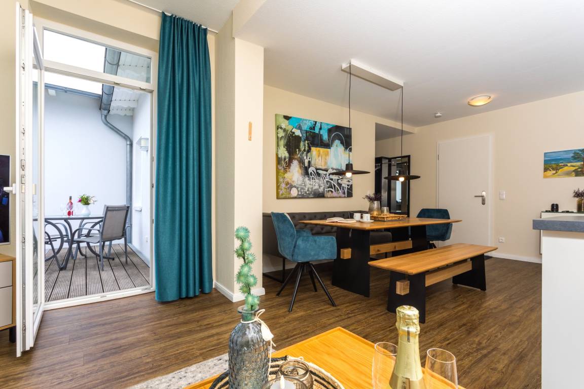 Der Wohnbereich bietet Ihnen ein gemütliches Ecksofa, Smart-TV, einen DVD-Player und ein digitales Radio. Zudem ist Internet über WLAN kostenfrei vorhanden. Die offene Küche ist modern ausgestattet. Ein Küchensofa und bequeme Drehstühle am Esstisch runden jedes Essen ab.