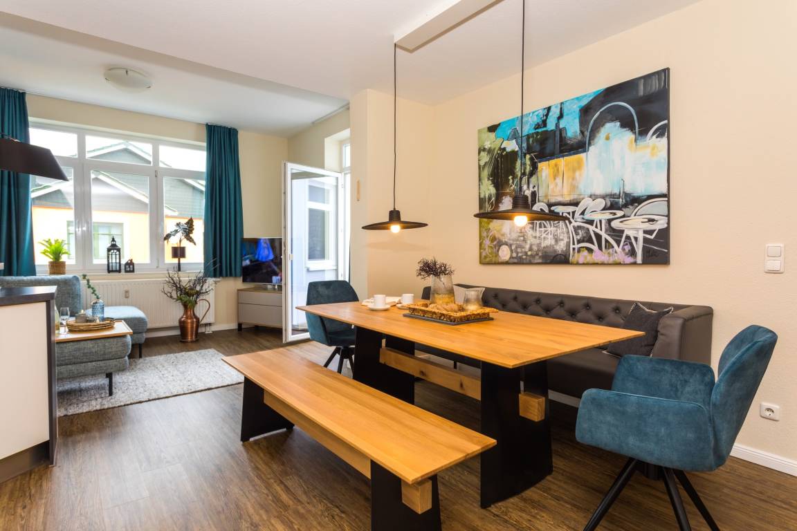 Die 63 m ² große und helle Ferienwohnung 12 befindet sich im Obergeschoss in der Villa Marin. Sie bietet mit ihren drei Zimmern ausreichend Platz für bis zu 4 Personen.