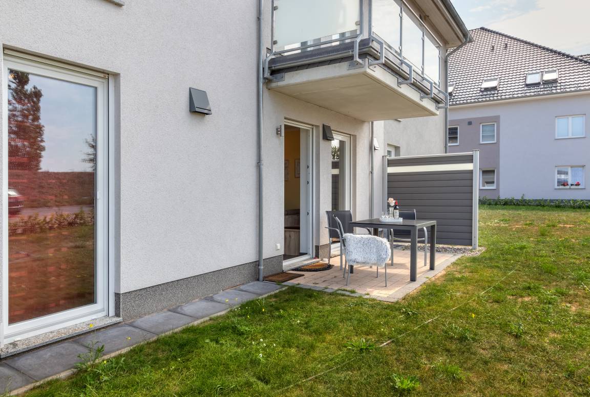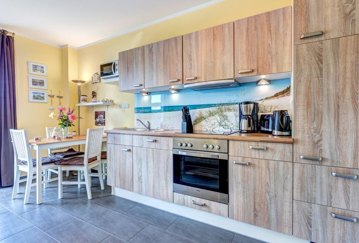 In der Ferienwohnung erwartet Sie eine komfortable Eckcouch, eine offene Küche und eine Terrasse mit Gartenblick. Ein Kaminofen sorgt für behagliche Wärme und die Sauna lädt nach dem Strandbesuch zu entspannten, wohltuenden Stunden ein.