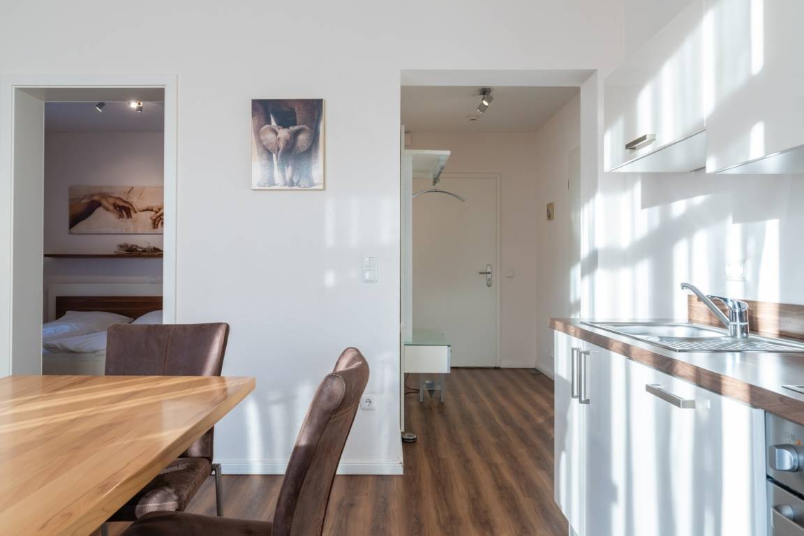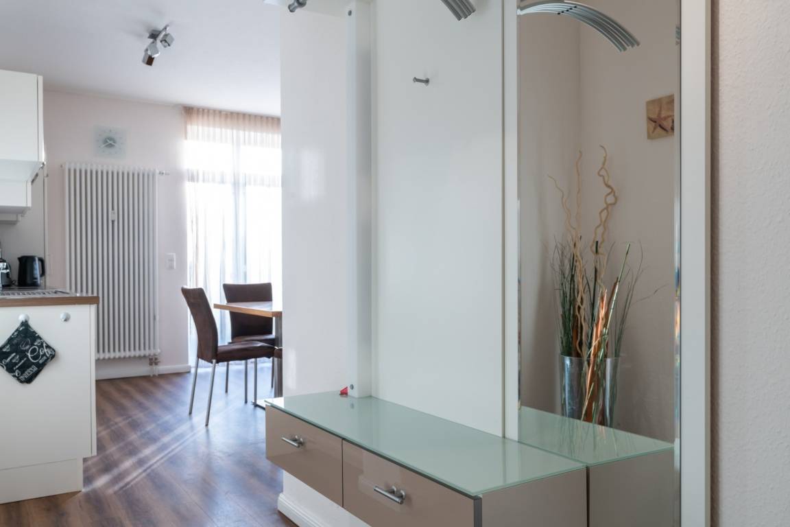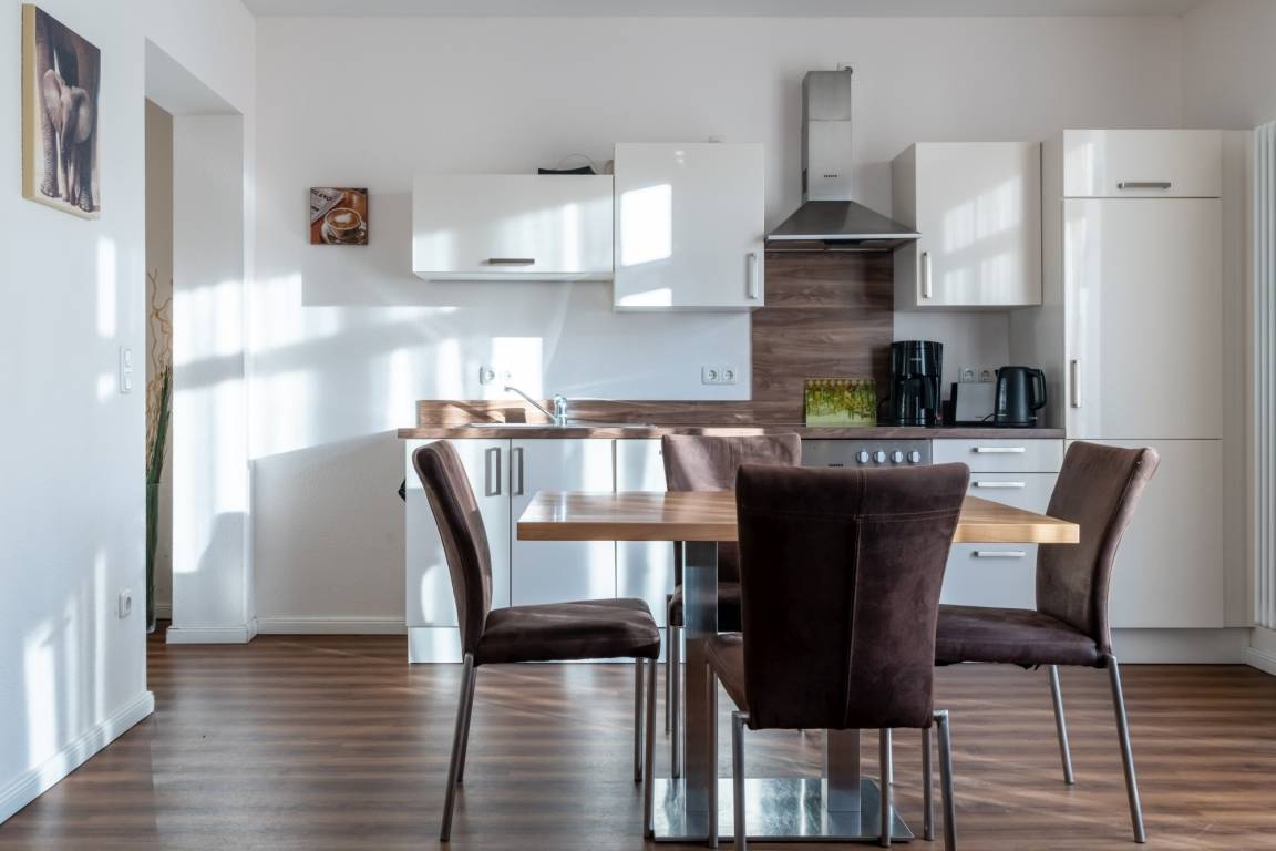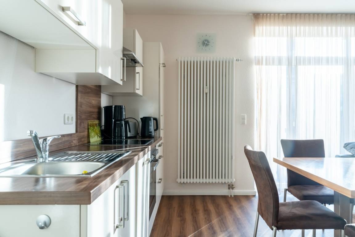 Die hier angrenzende Küchenzeile ist mit einem Kühlschrank mit Gefrierfach, einem Geschirrspüler und einem Backofen mit Cerankochfeld ausgestattet. Eine Kaffeemaschine, ein Toaster und ein Wasserkocher stehen Ihnen hier selbstverständlich zur Verfügung.