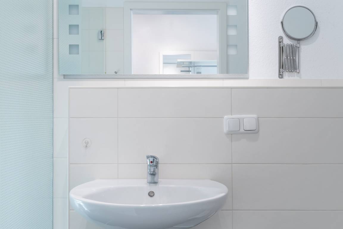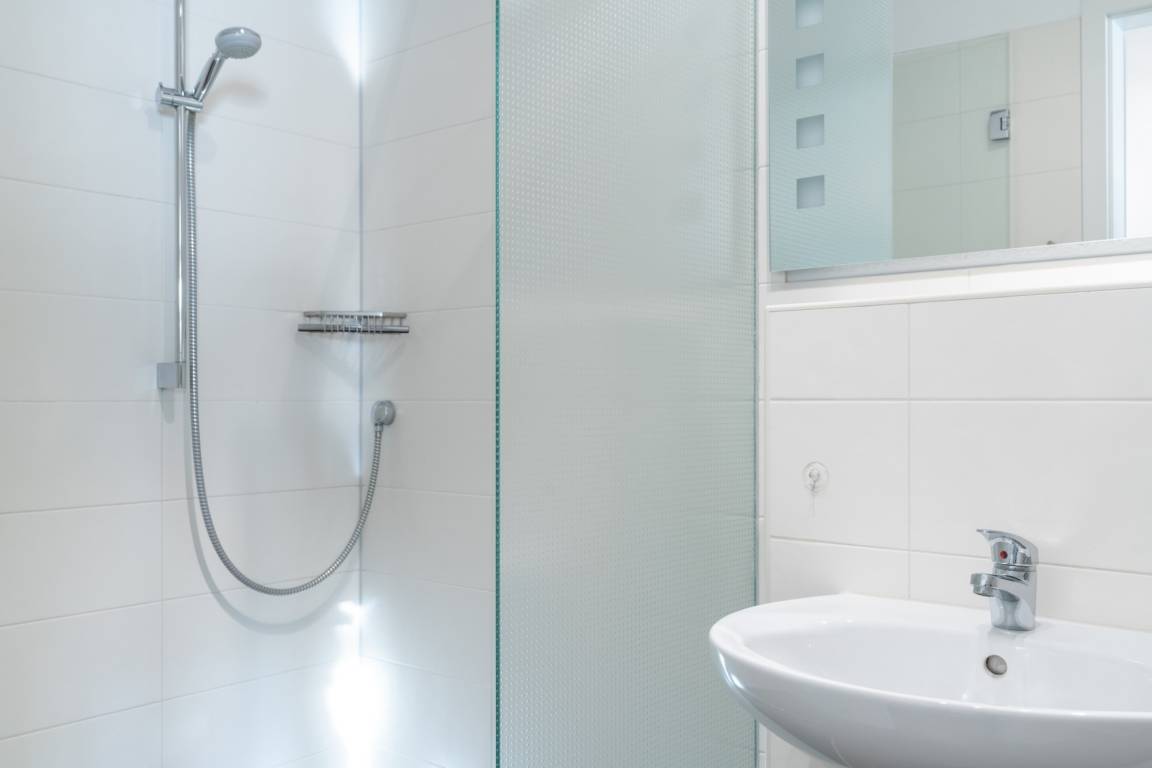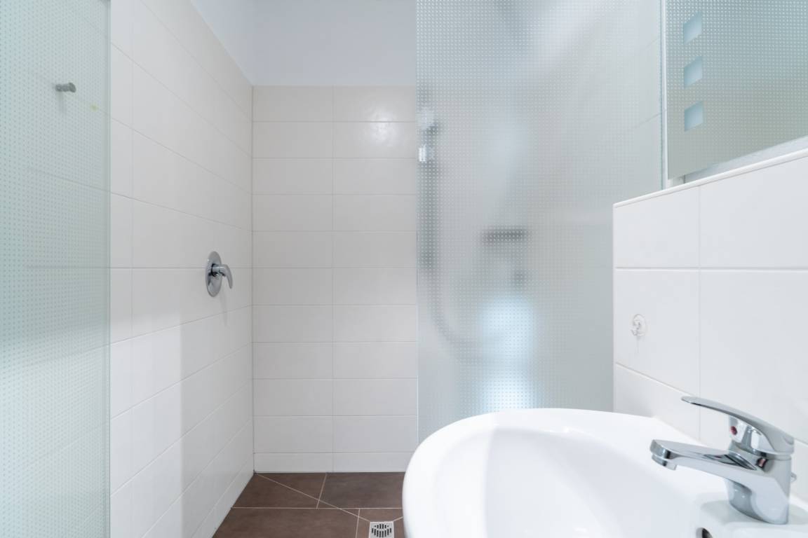 Das Badezimmer verfügt über eine Dusche (ebenerdig) und WC.