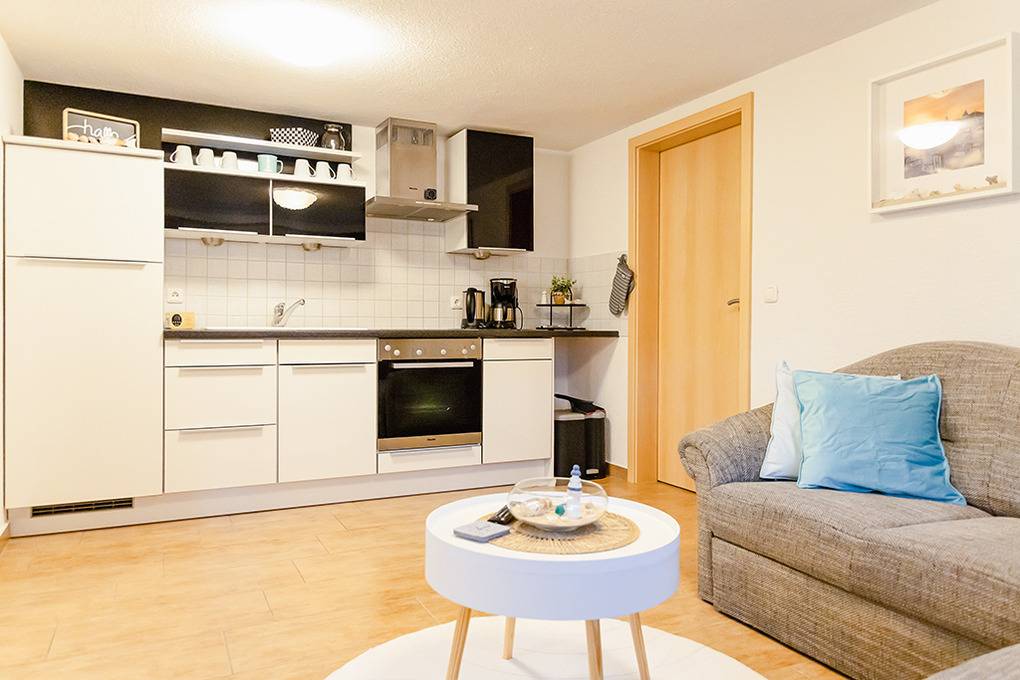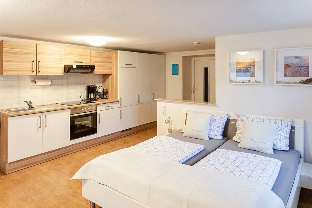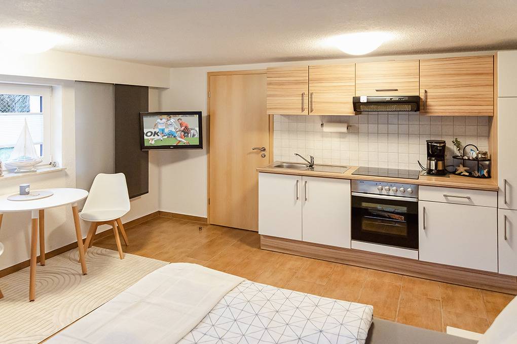 Separater Zugang zu jeder Ferienwohnung. Souterrain: Vier Wohn-/Essräume, jeweils mit Couchgarnitur , Sat-TV, Radio/CD, Esstisch, Einbauküche (Backofen,Mikrowelle, teilweise Spülmaschine). Drei Doppelzimmer. Einzelzimmer. Schlafcouch (1 Pers.). Studio mit Doppelbett. 4 Bäder mit Dusche, WC. Separater Essraum mit Tisch für 10 Pers.