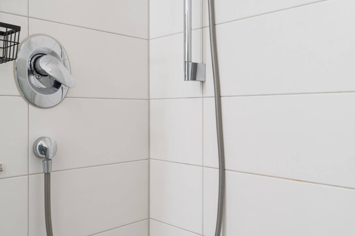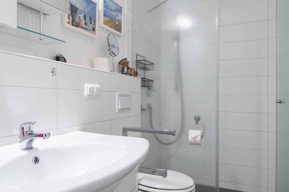 Das Badezimmer verfügt über eine Dusche (ebenerdig) und WC.