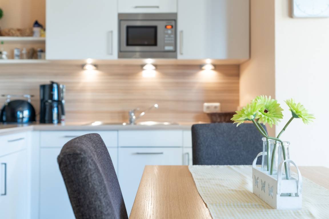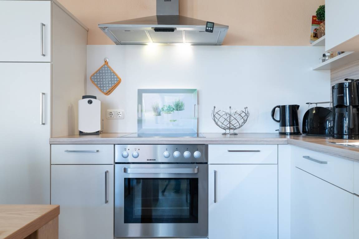Die hier angrenzende Küchenzeile ist mit einem Kühlschrank mit Gefrierfach, einem Geschirrspüler und einem Backofen mit Cerankochfeld ausgestattet. Eine Kaffeemaschine, ein Toaster und ein Wasserkocher stehen Ihnen hier selbstverständlich zur Verfügung.