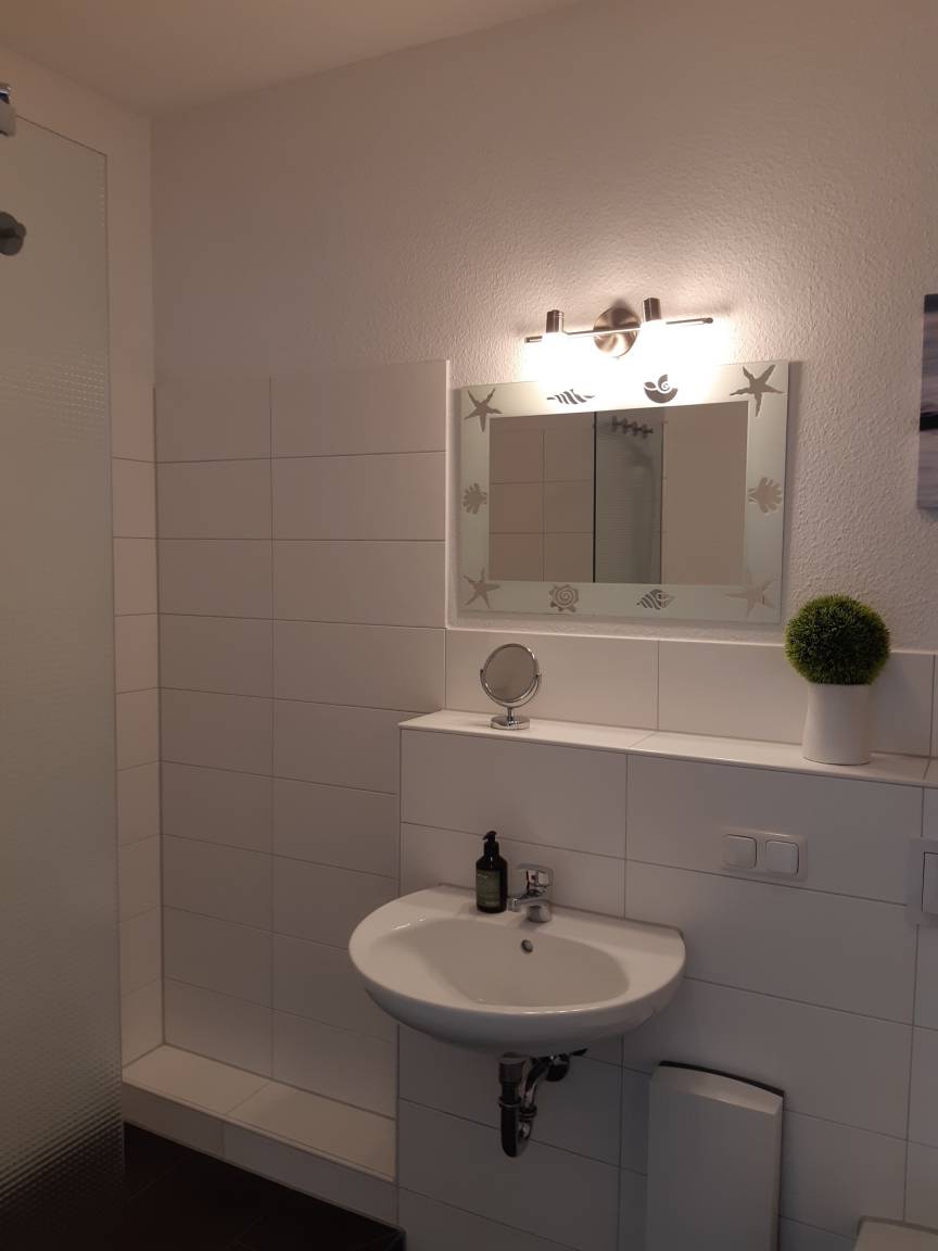 Das Badezimmer verfügt über eine Dusche (mit Absatz) und WC.