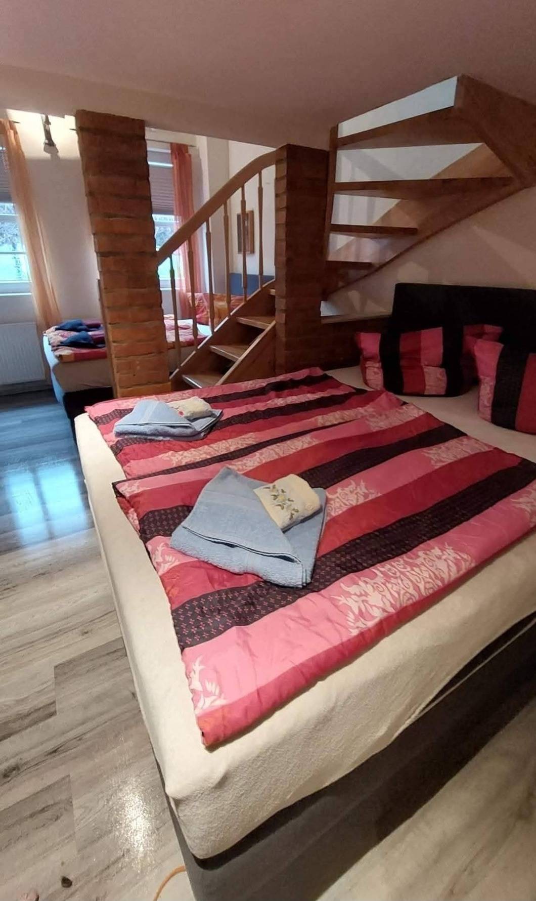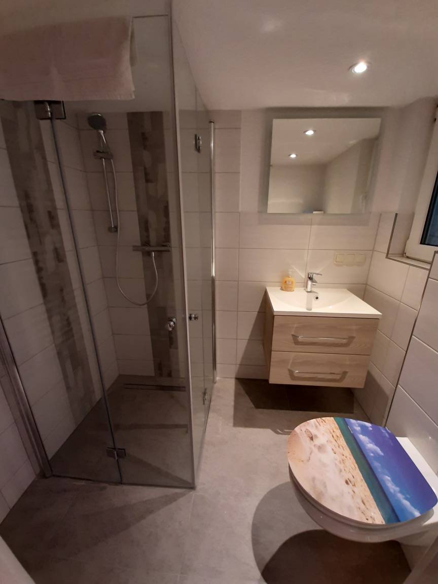 Unsere große Wohnung ist für bis zu 10 Personen geeignet und geht über 2 Etagen. Der Wohn-Essbereich sowie die Bäder und 2 Schlafzimmer befinden sich im Erdgeschoß, die restlichen 2 Schlafzimmer befinden sich im Obergeschoß.