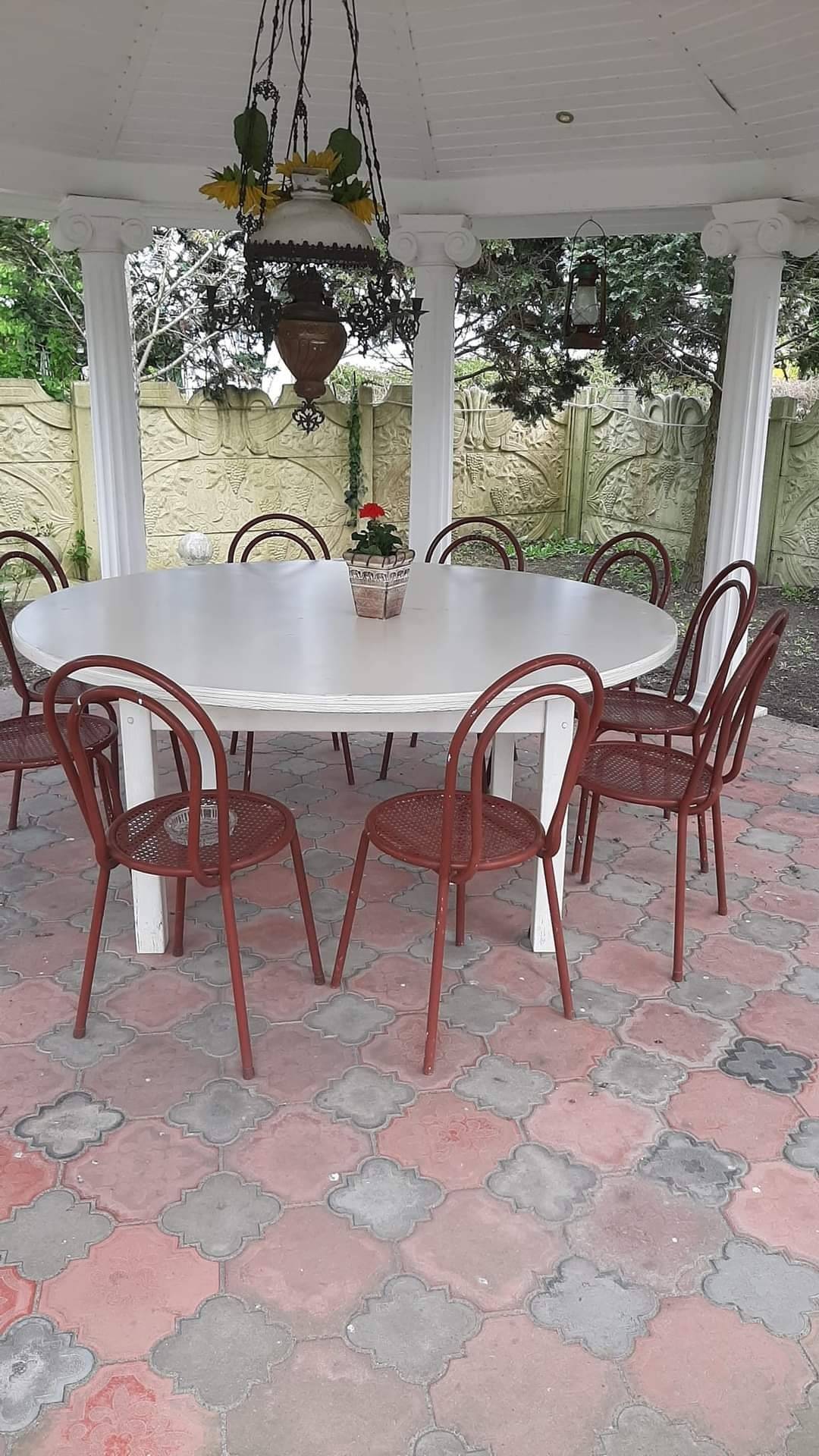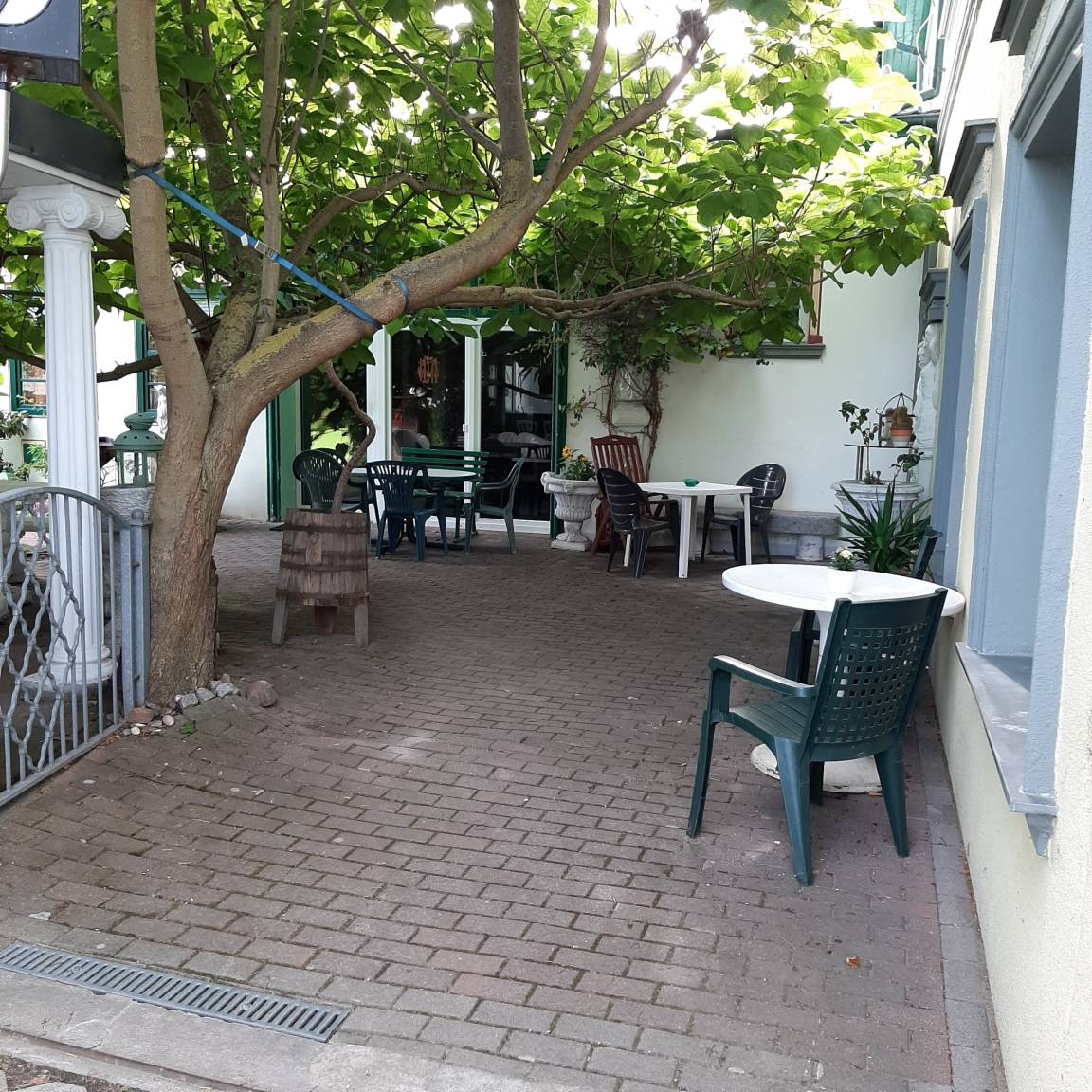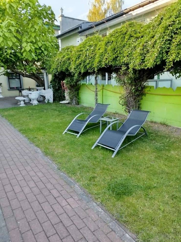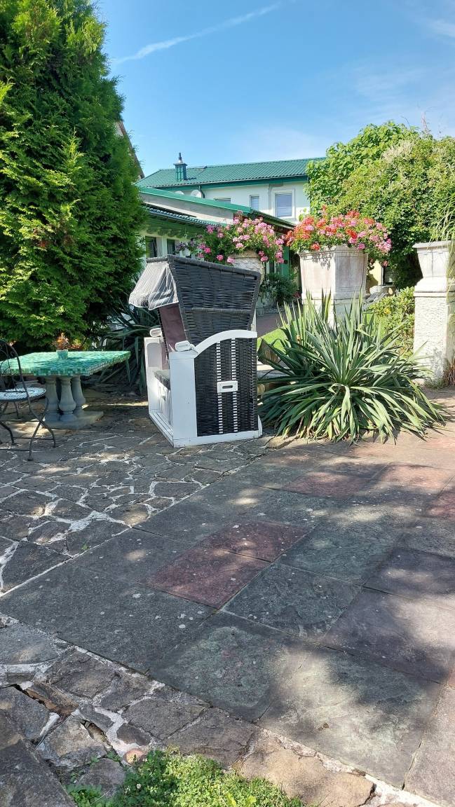 Vor der Wohnung im Freien gibt es eine Sitzguppe.