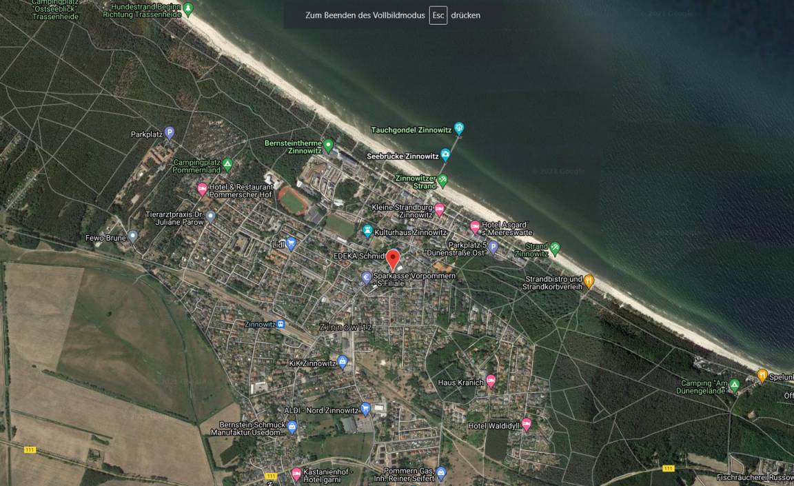 Zinnowitz liegt im Norden Usedoms am nördlichen Ende einer etwa ein bis zwei Kilometer breiten Landzunge zwischen Achterwasser und Pommerscher Bucht, hat 3.777 Einwohner und jährlich 1917 Sonnenscheinstunden.