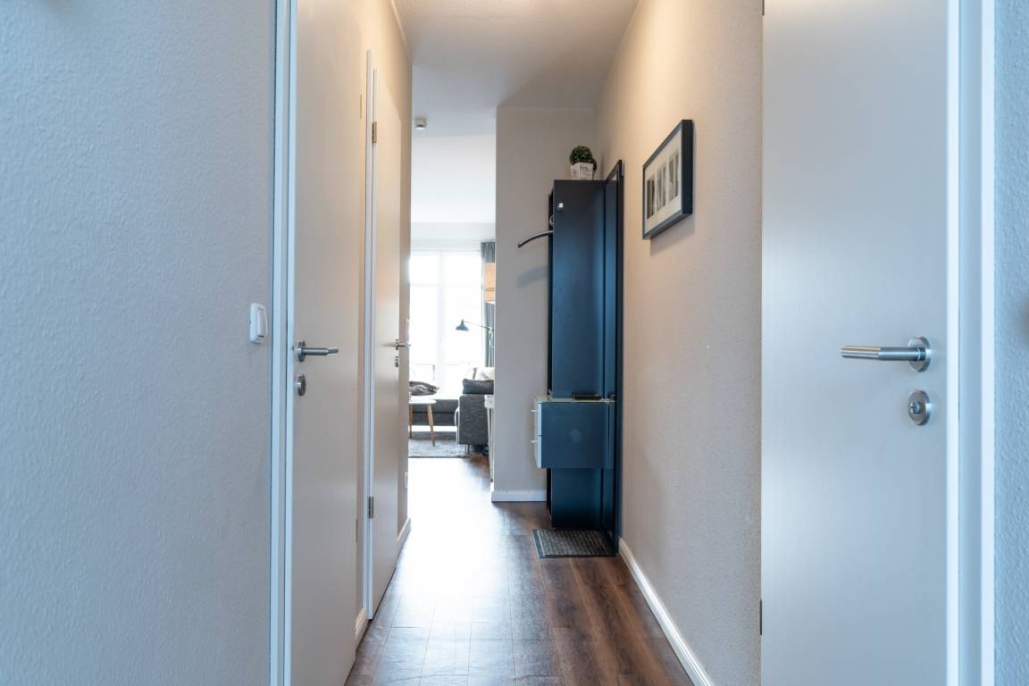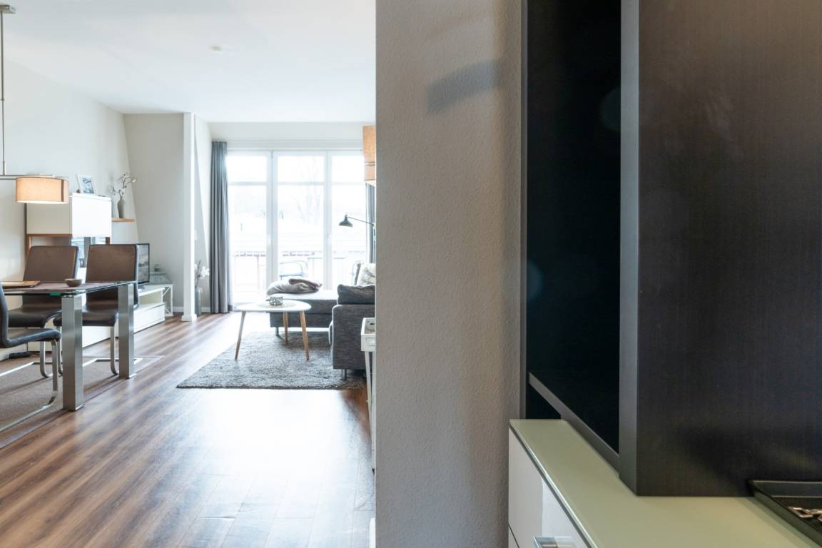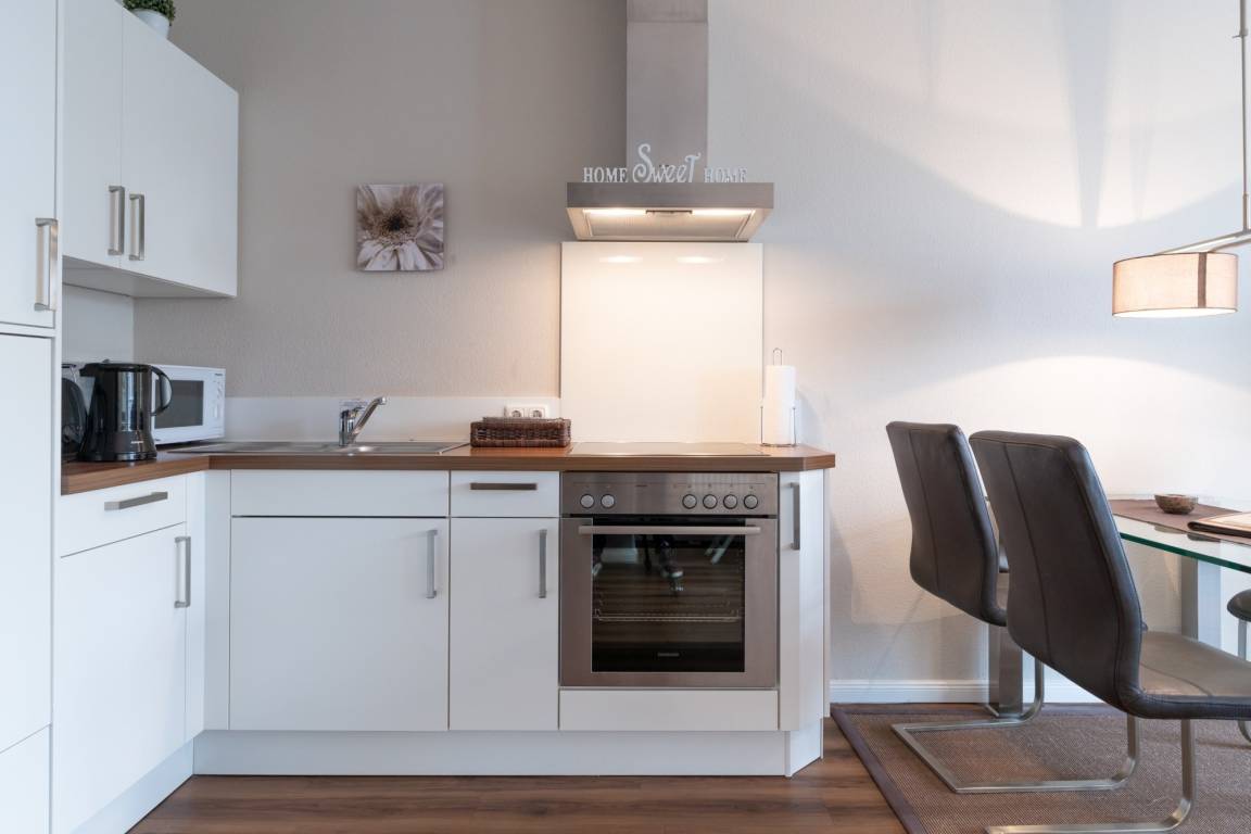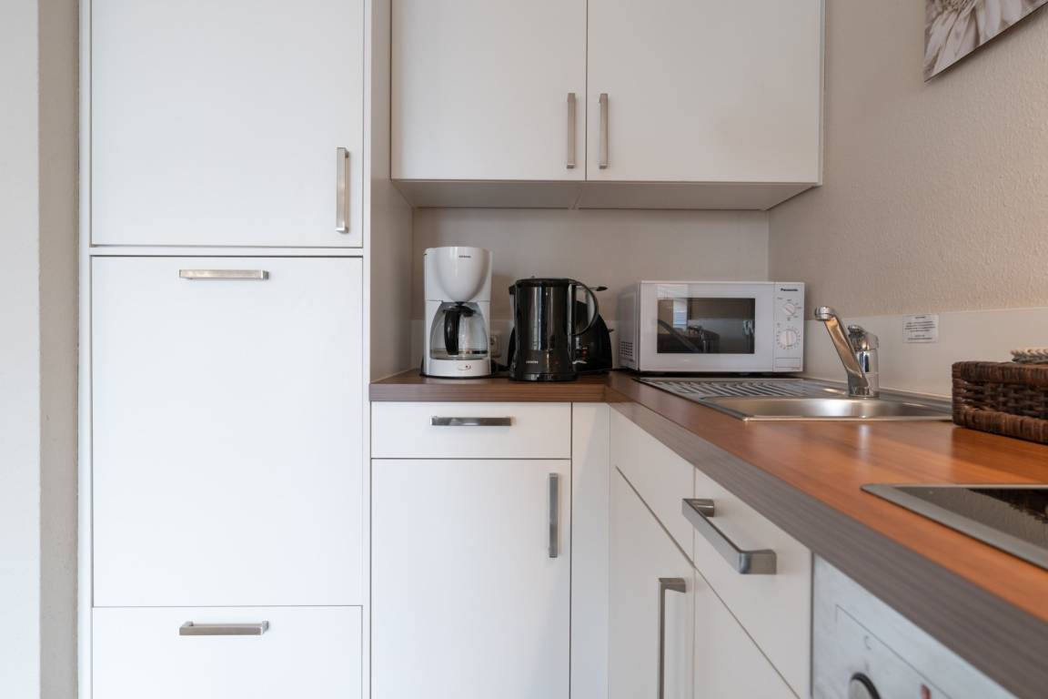 Die hier angrenzende Küchenzeile ist mit einem Kühlschrank mit Gefrierfach, einem Geschirrspüler und einem Backofen mit Cerankochfeld ausgestattet. Eine Kaffeemaschine, ein Toaster und ein Wasserkocher stehen Ihnen hier selbstverständlich zur Verfügung.