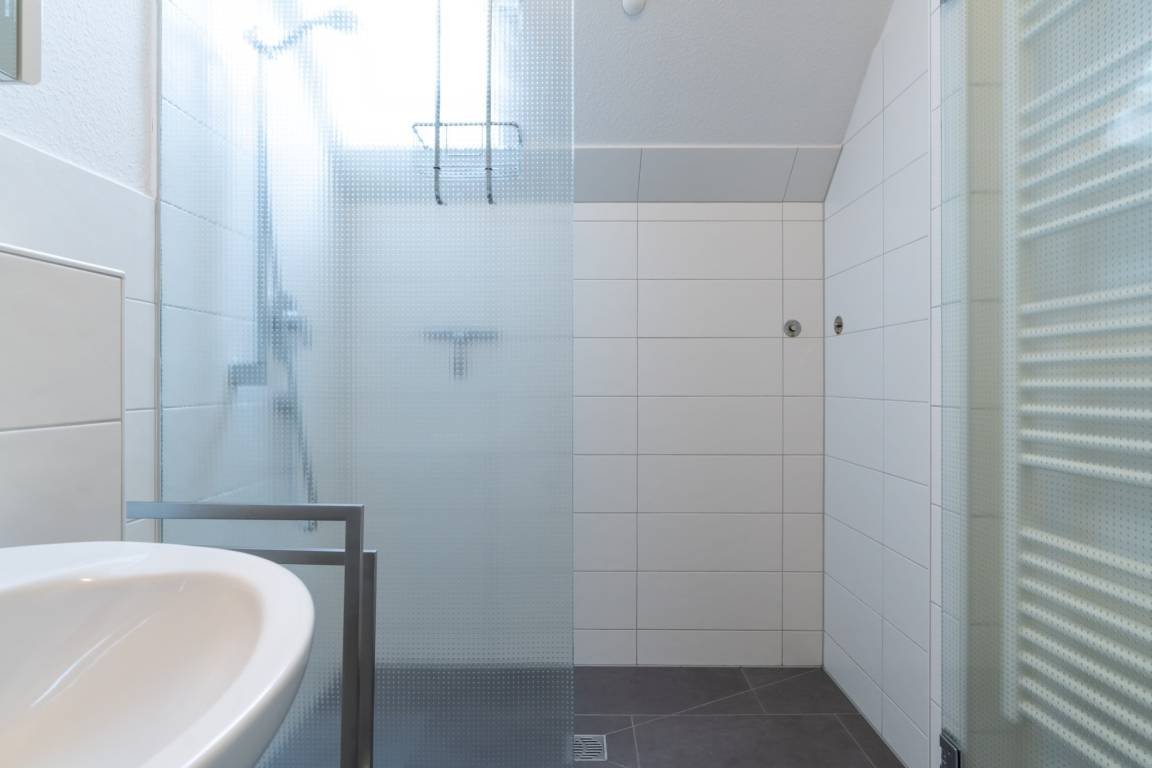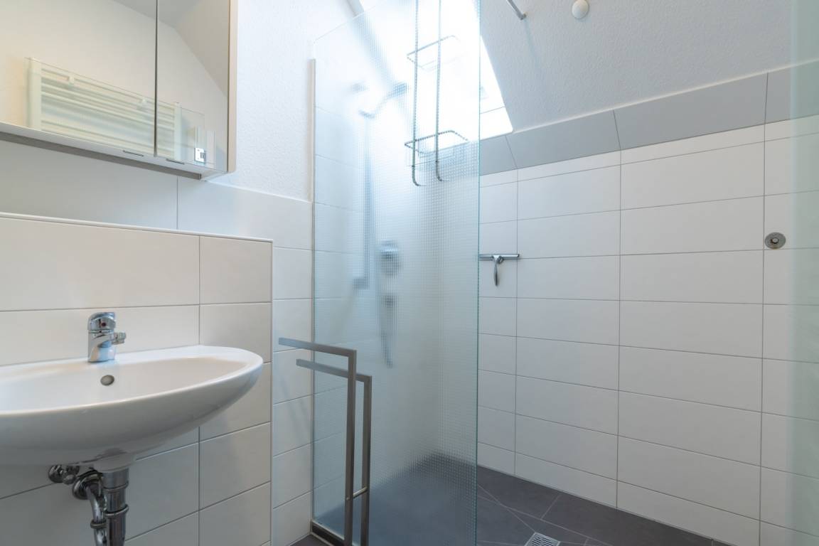Das Badezimmer verfügt über eine Dusche (mit Absatz) und WC.