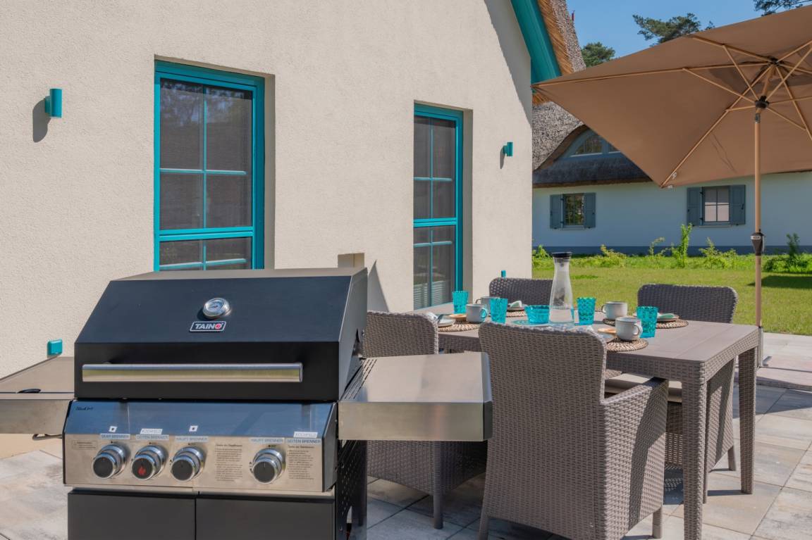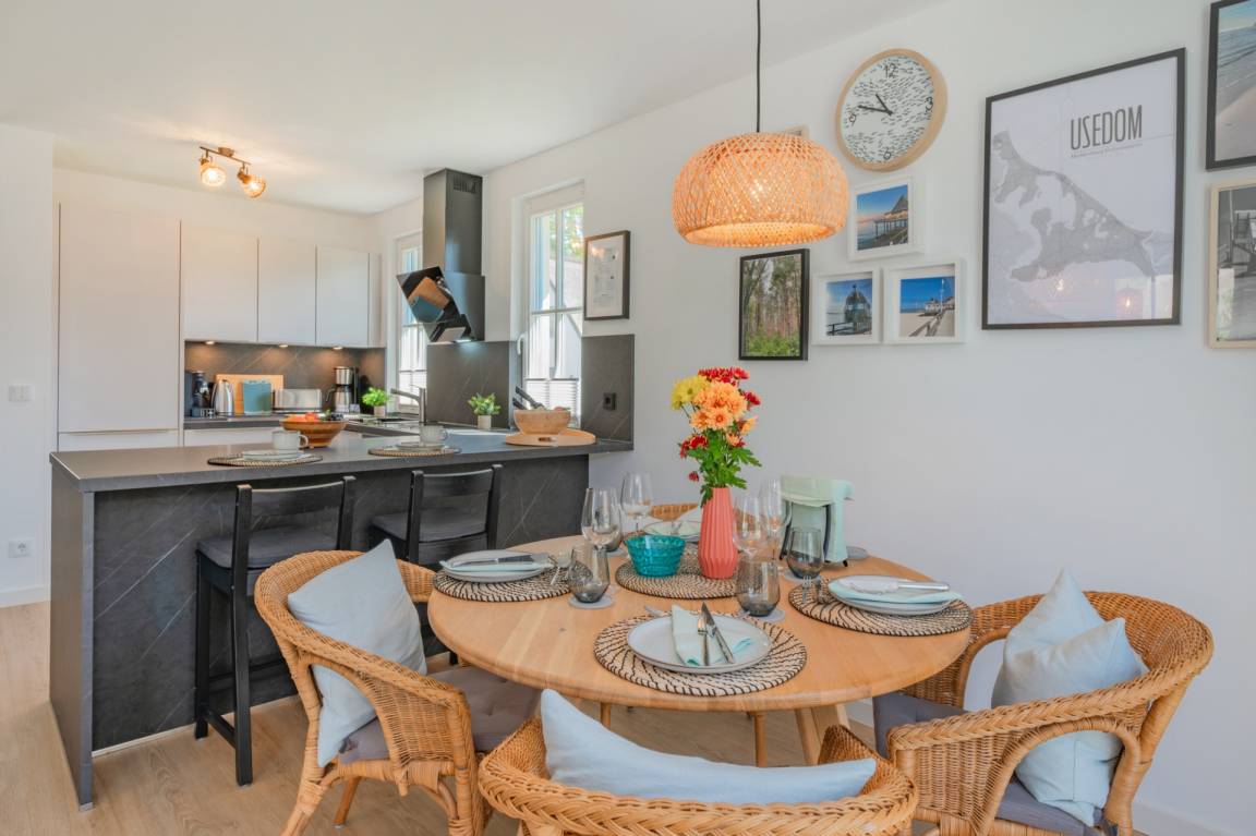 Der großzügig kombinierte Wohn- und Essbereich führt Sie direkt zur Terrasse, auf der Sie die Sonnenstunden Usedoms genießen können. Die Terrasse ist mit Sitzmöbeln, Sonnenliegen, Sonnenschirm und einem Gasgrill (April-Oktober) ausgestattet.