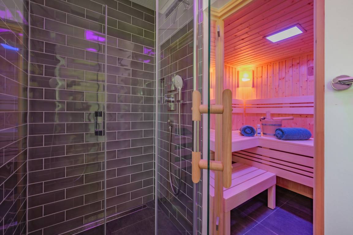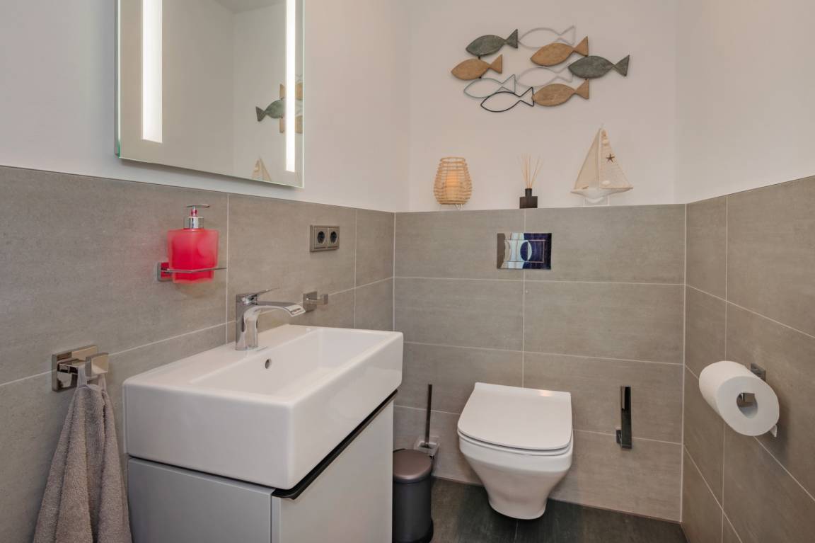 Außerdem befindet sich im Erdgeschoss eine Sauna mit Farbwechsel-Licht, einer einzigartigen SPA-/ XXL- Regendusche mit vielen Funktionen, einem Gäste-WC und dem Technikraum mit einem Wasch-Trockner, zum praktischen Durchwaschen von Strandtüchern.
