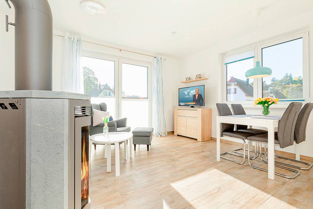 D 28.37 Ferienhaus 2-4 Pers.: Komfortables 3-Zimmer-Ferienhaushälfte mit 69 qm Wohnfläche über 2 Etagen (Nichtraucherhaus). Parterre: Heller, freundlicher Wohn-/Essraum mit Kaminofen, Couchgarnitur, Sat-TV, DVD-Player, Esstisch, moderner Einbauküche (Backofen, Spülmaschine). Bad/WC. 1. Etage Doppelzimmer mit Sat-TV. 2-Bettzimmer mit Sat-TV. Bad/WC.