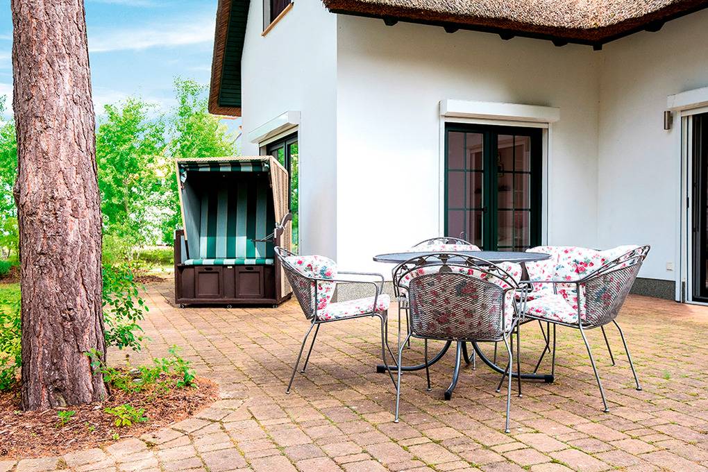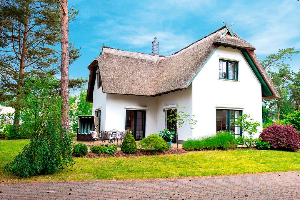 Haus: Großzügig angelegte Ferienhausanlage auf großem gepflegtem Areal (10 ha) mit lichtem Baumbestand. Hochwertiges, reetgedecktes Ferienhaus mit offenem Kamin. 2 separate Schlafzimmer, 2 Bäder. Gehobene Ausstattung mit geschmackvoller Möblierung. Fußbodenheizung. Terrasse mit Sitzmöbeln. Kostenloser Internetzugang über Wlan. 1 Pkw-Stellplatz/Haus.